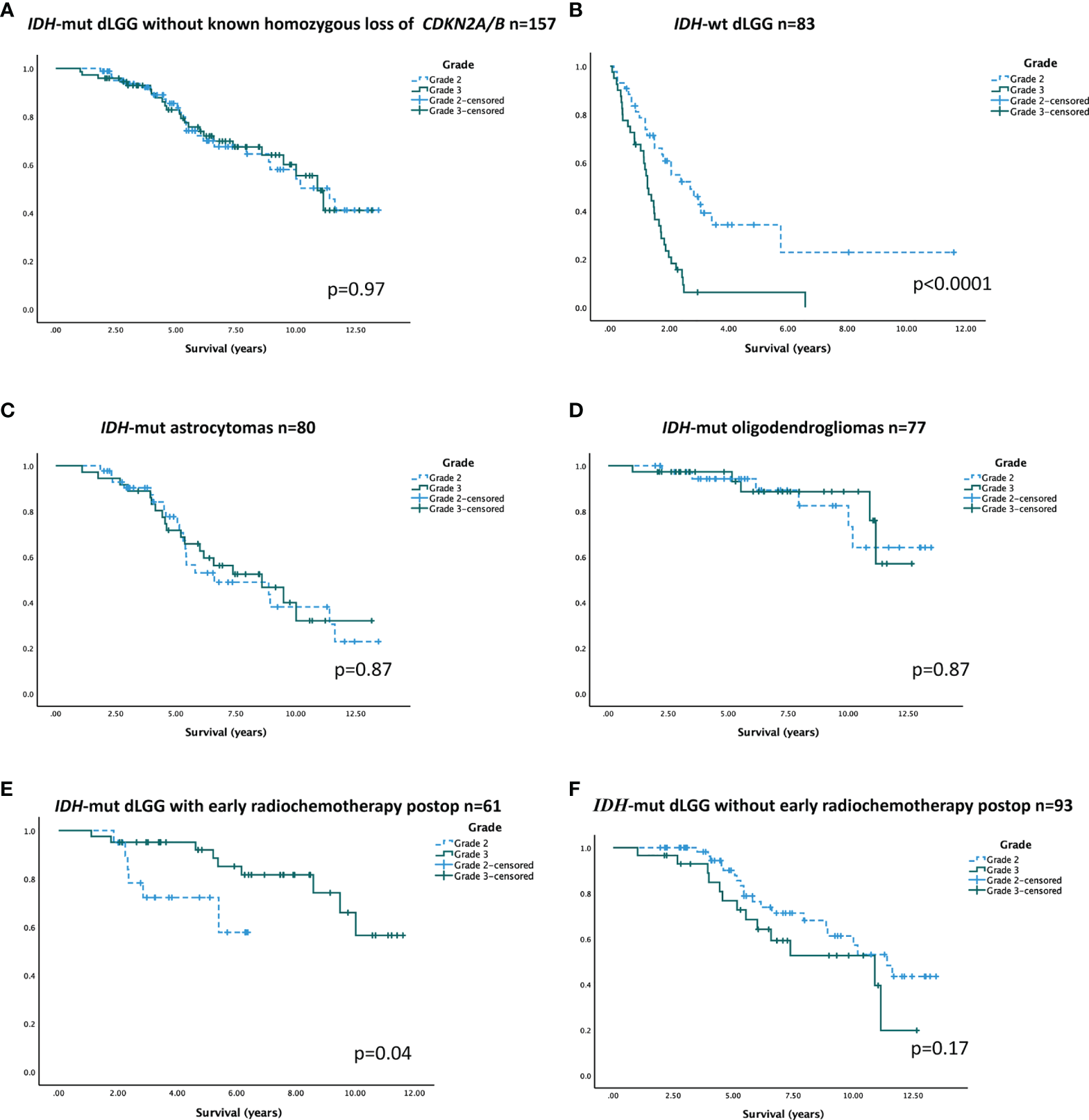 Overall survival over WHO grade in different patient subgroups (A–F). (A)IDH-mut dLGG (grade 2; 11.4 years; 95% CI 8.7–14.1 and grade 3; 10.9 years; 95% CI 9.5–12.3). (B)IDH-wt dLGG (grade 2; 2.7 years; 95% CI 1.7–4.7 and grade 3; 1.3 years; 95% CI 1.0–1.5). (C)IDH-mut astrocytoma (grade 2; 6.6 years; 95% CI 1.8–11.4 and grade 3; 8.6 years; 95% CI 5.2–11.9). (D) Oligodendroglioma (median survival not reached). (E)IDH-mut patients receiving radio-chemotherapy within 6 months postoperative (median survival not reached). (F)IDH-mut tumor patients not receiving radio-chemotherapy within 6 months postoperative (grade 2; 11.4 years; 95% CI 9.3–13.5 and grade 3; 10.9 years; 95% CI 4.9–16.9). In all figures showing IDH-mut tumors, tumors with known CDKN2A/B homozygous deletions were omitted.