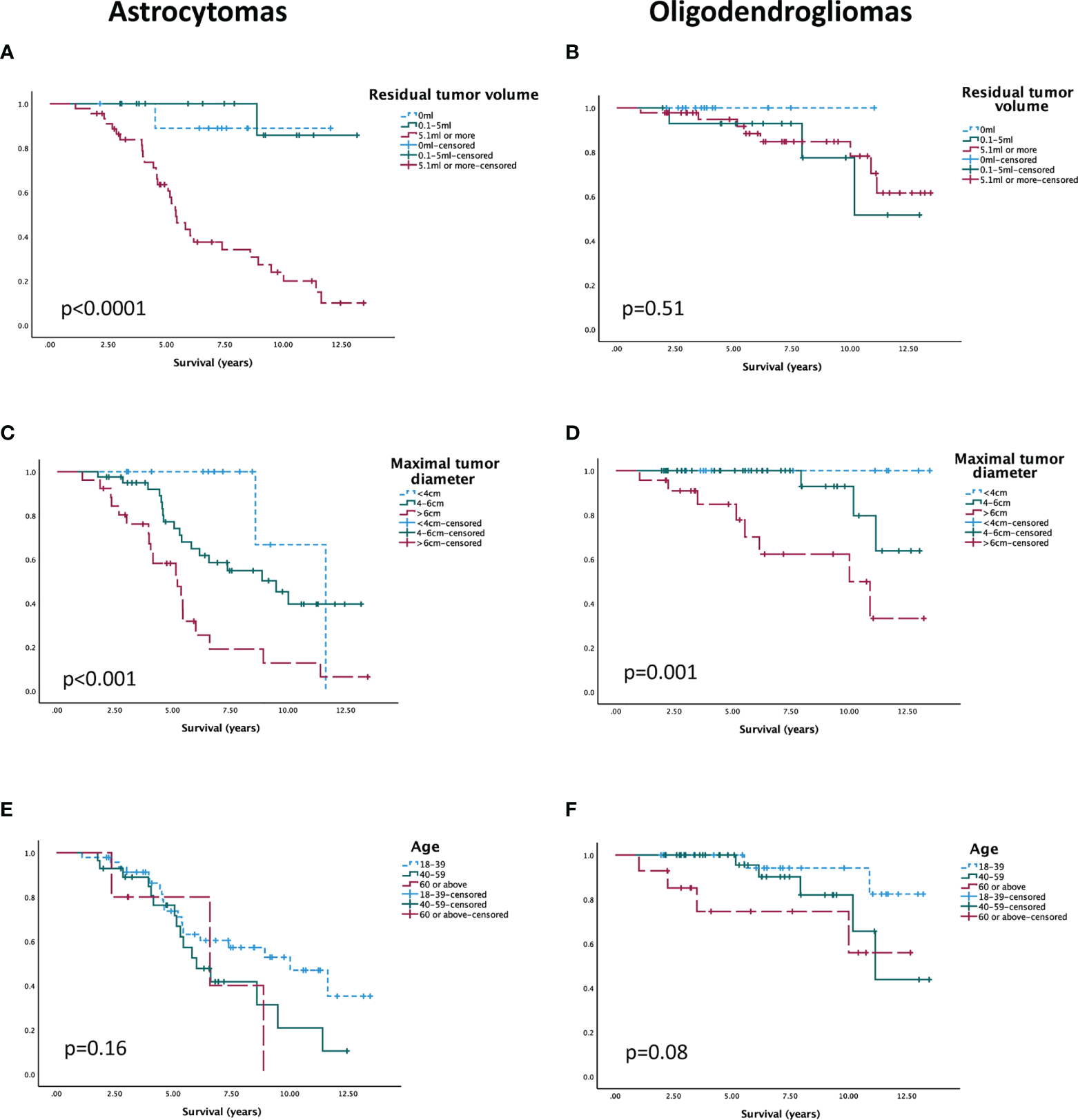 There was no survival benefit for patients with WHO grade 2 over grade 3 IDH-mut dLGG after exclusion of tumors with known CDKN2A/B homozygous deletion (n=157) (log-rank p=0.97). This was true also after stratification for oncological postoperative treatment and when astrocytomas and oligodendrogliomas were analyzed separately. In IDH-mut astrocytomas, residual tumor volume after surgery was an independent prognostic factor for survival (HR 1.02; 95% CI 1.01–1.03; p=0.003), but not in oligodendrogliomas (HR 1.02; 95% CI 1.00–1.03; p=0.15). Preoperative tumor size was an independent predictor in both astrocytomas (HR 1.03; 95% CI 1.00–1.05; p=0.02) and oligodendrogliomas (HR 1.05; 95% CI 1.01–1.09; p=0.01). Age was not a significant prognostic factor in multivariable analyses (astrocytomas p=0.64, oligodendrogliomas p=0.08).