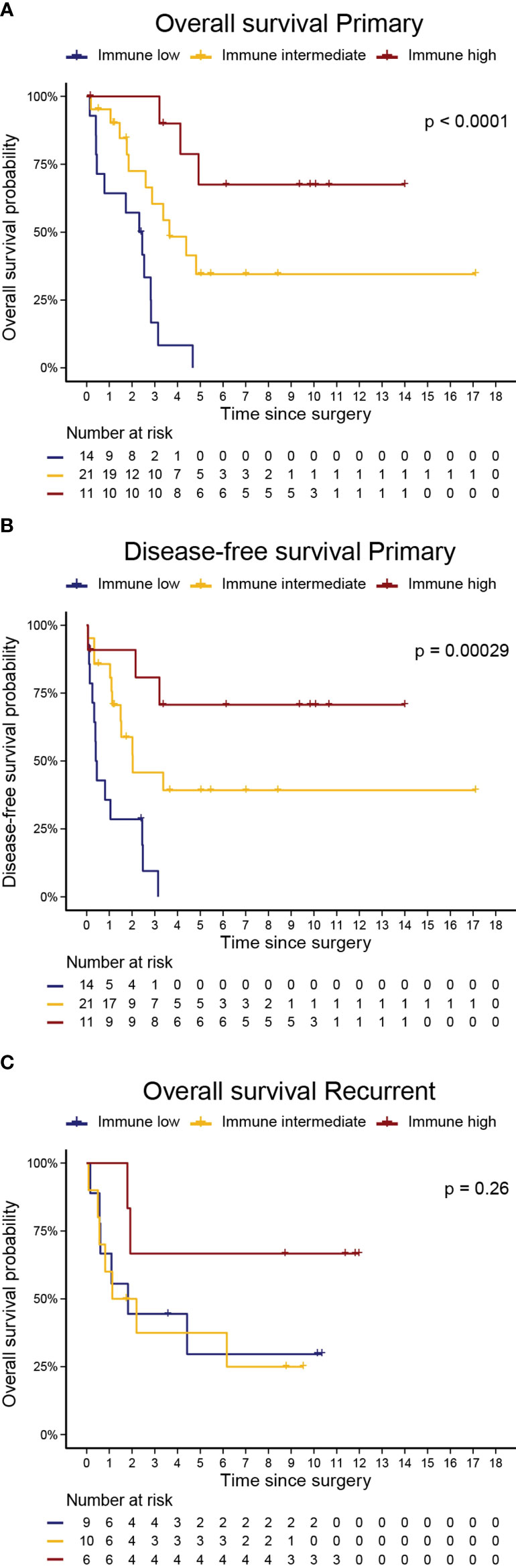 In primary UPS, the immune clusters were significantly associated with both OS (log-rank p<0.0001) and DFS (p<0.001). The median OS was 29 months, 44.3 months, and not reached in the immune low, intermediate, and high clusters, respectively. The median DFS was 5.2 months, 24.7 months, and not reached in the immune low, intermediate, and high clusters, respectively. In the recurrent setting, there was a trend for better OS in the immune high cluster (log-rank p=0.26; Figure 4).