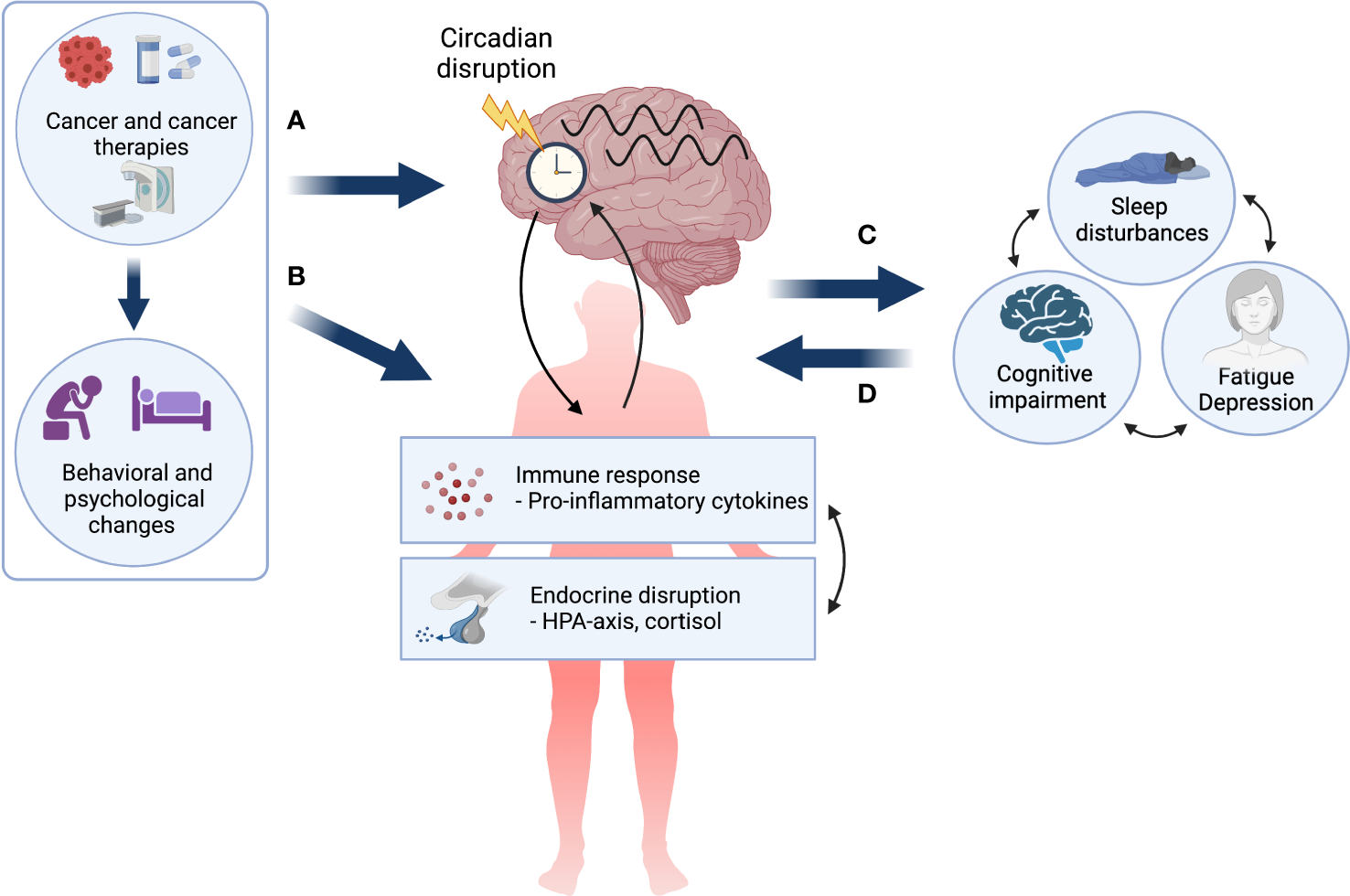 The circadian disruption hypothesis of cancer- and cancer treatment-related symptoms. Cancer and its treatment, as well as associated behavioral and psychological changes may (A) directly impact the circadian system resulting in circadian disruption in both biological and behavioral rhythms, and (B) lead to a dysregulated immune response and endocrine disruption, which are themselves bidirectionally linked and may both impact the circadian system. Circadian disruption may result in cancer- and treatment-related symptoms (CTRS) or exacerbate pre-existing symptoms (C). Finally, it is important to note that once manifested, chronic CTRS burden may further alter both behavioral and pathophysiological factors creating a self-perpetuating negative loop (D). Created with BioRender.com.