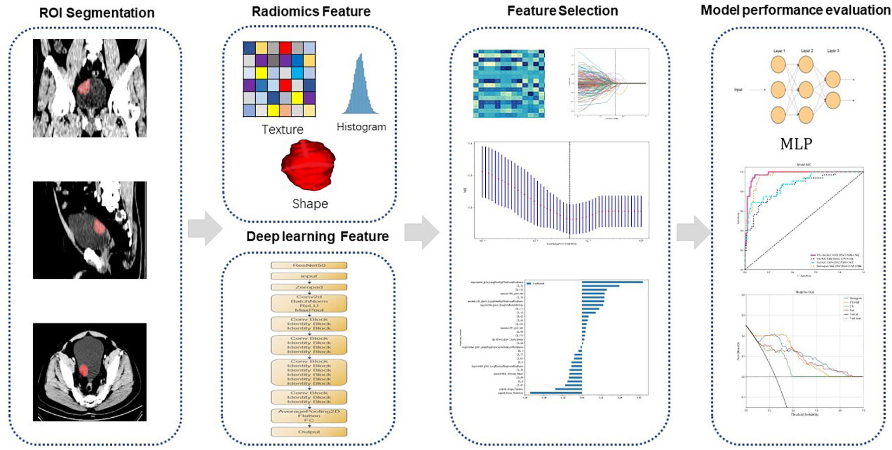Predictive models were constructed using radiomics combined with deep transfer transfer learning features. A variety of machine learning algorithms were tested, including LR、SVM、KNN、Random Forest、ExtraTrees、XGBoost、LightGBM, and deep learning-multilayer perception (MLP). With cross-test, all model parameters were optimized using scikit-learn’s GridSearch function. The MLP model uses three hidden layers with hidden dims of 256, 128, and 64. Adam optimizes and the learning rate is cohort to be 0.0001. Deep learning and radiomics signature building and model evaluation Described in detail in the Supplementary Material.