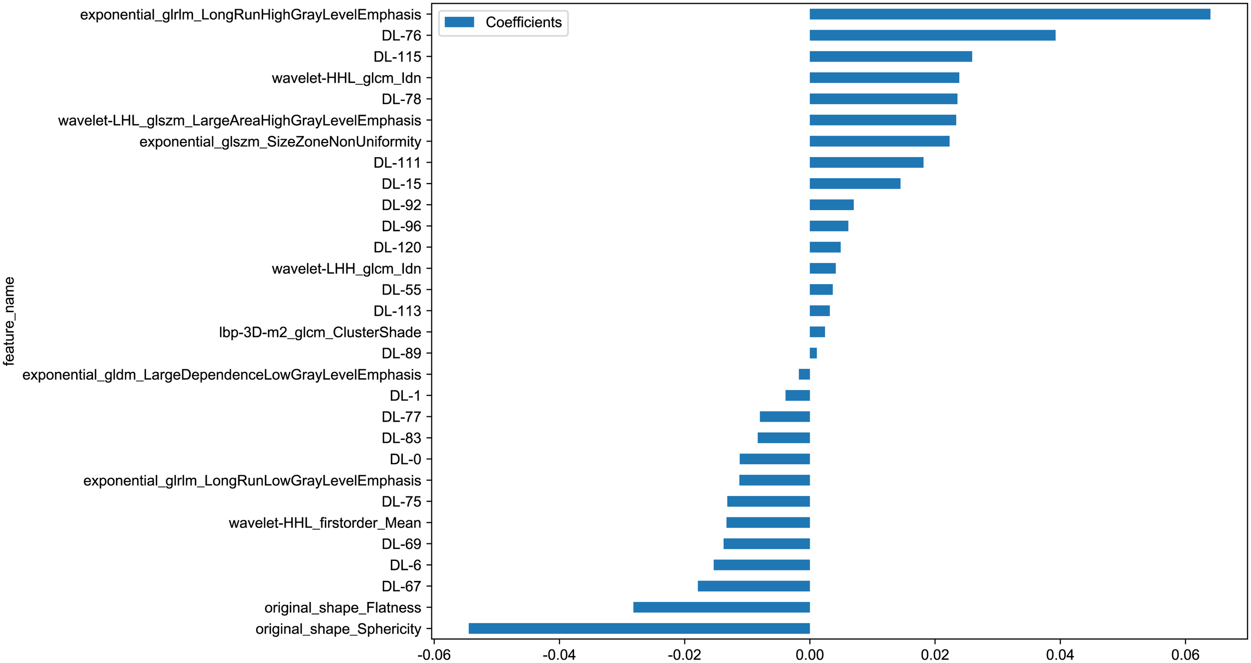 We further explored whether model performance could be improved by fusing radiomics and deep learning features. Using 1735 radiomics features and 128 deep transfer learning features, we constructed a deep learning radiomics (DLR) signature. To obtain optimal features, we further reduce the dimensions of the fused features by LASSO after we have reduced and compressed the features using ICC, Spearman rank correlation coefficient, and PCA. In LASSO, the coefficients of many irrelevant features are set to zero entirely, depending on the weights λ. A minimum standard of 10-fold cross-validation was used in order to determine the optimal λ, where the final value of λ produced the smallest cross-validation error (Figures 4A, B). The DLR signature is constructed by linearly combining non-zero coefficients. By combining selected features weighted by their coefficients, Rad-scores is calculated by a linear combination of non-zero coefficients from selected features selected by LASSO. Ultimately, we selected 30 coefficients that contain 11 radiomics features and 19 deep learning features. Figure 5 shows the Rad-score histogram.
