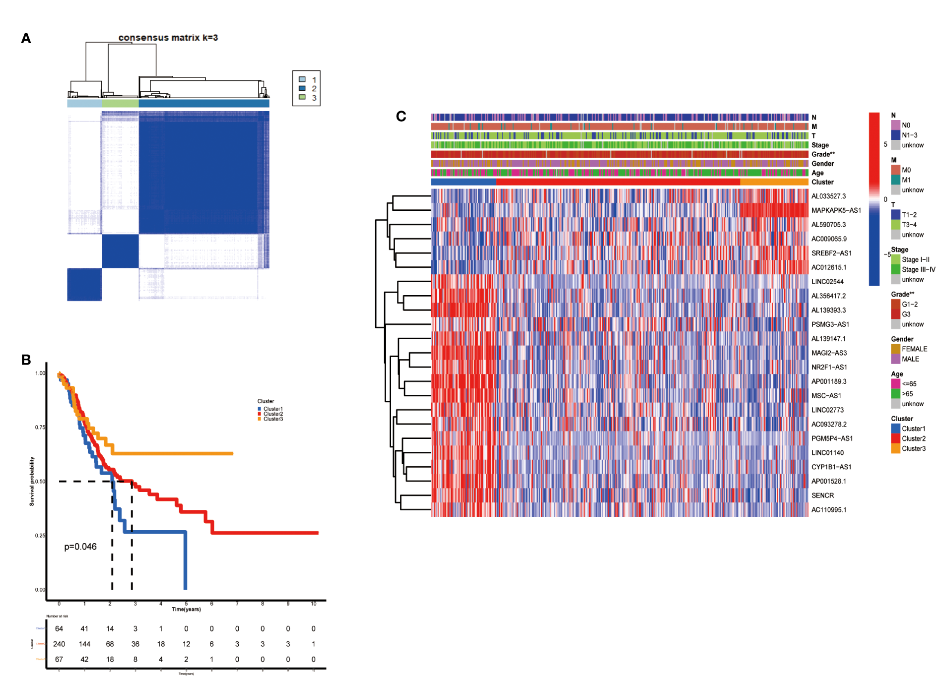 According to the analysis performed using the Consenses cluster Plus R package, metabolic lncRNAs in GC were divided into different clusters. When the consensus matrix k value was equal to 3, there was the least crossover among the GC samples. Therefore, we divided GC clusters into three types: cluster 1(n=64), cluster 2(n=240) and cluster 3(n=67) (Figure 2A; Figure S1). We ran a survival analysis according to the lncRNA patterns to evaluate the prognostic value of metabolic lncRNAs. As shown in the image, the OS of GC patients was significantly different among the three clusters (p=0.046). GC patients in cluster 1 suffered the worst OS (Figure 2B). The heatmap showed the expression of prognosis-related metabolic lncRNAs and their correlation with clinicopathological parameters in different clusters. No significant differences were detected among other clinical characteristics except for the grade of GC (Figure 2C).