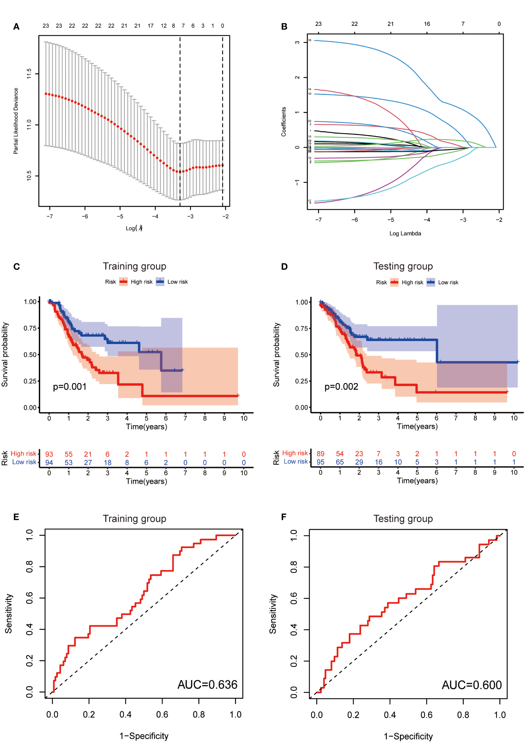 Establishment of risk score model. (A) The distribution of lambda and the best options in Lasso analysis (B) The weight of each candidate gene in the model. (C, D) Kaplan-Meier survival curves of the OS of patients between the high- and low-risk groups in the training (C) and testing (D) set. (E, F) The ROC curves of the risk score model in training (E) and testing (F) group.