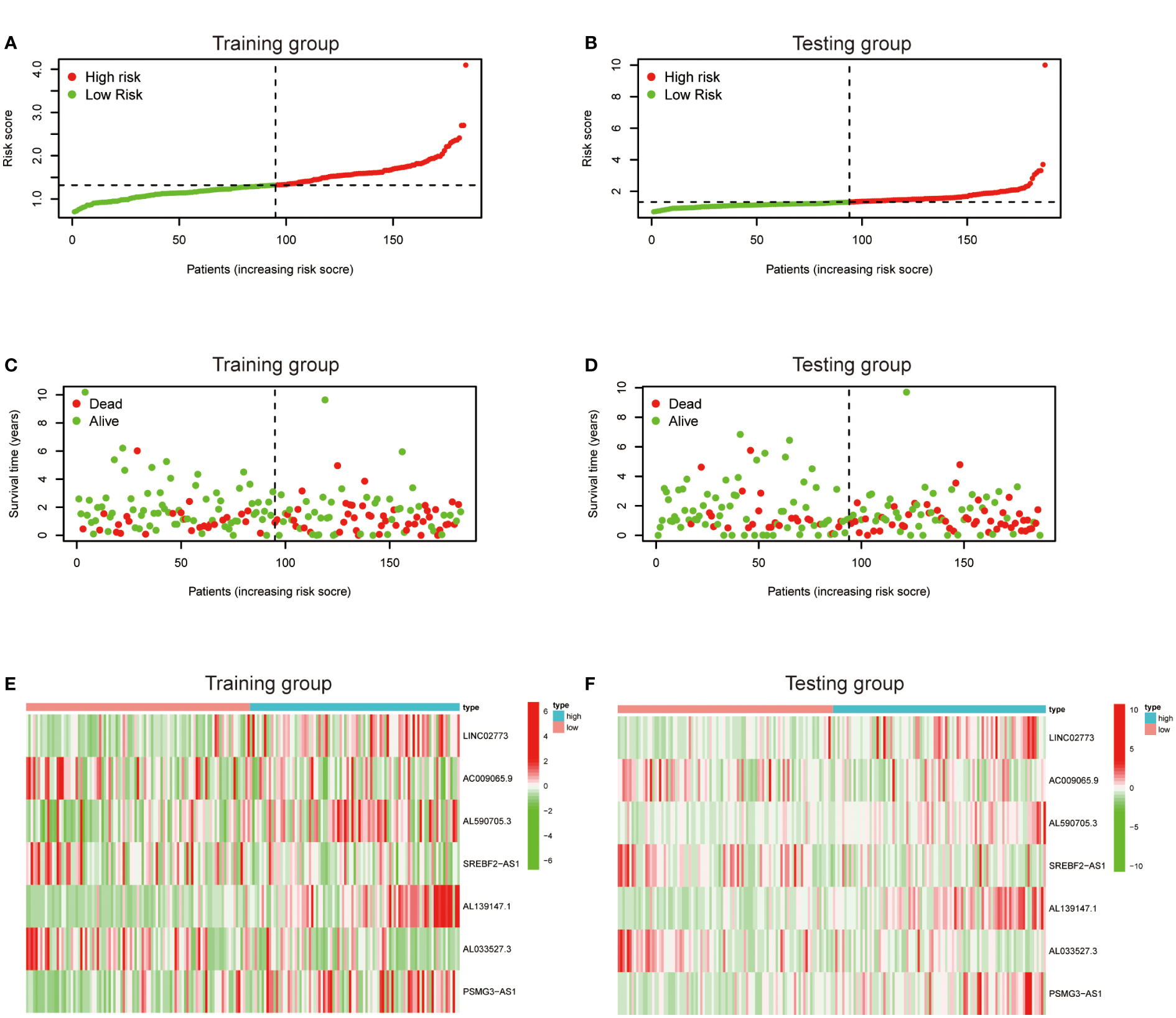 Prognostic value of the risk score model. (A, B) Patterns of survival status and survival time in the training and testing group. (C, D) Distribution of metabolic lncRNAs risk score model in the high- and low-risk groups plotted in training and testing set. (E, F) Heatmap showed the expression standards of the seven prognostic lncRNAs of training and testing set.