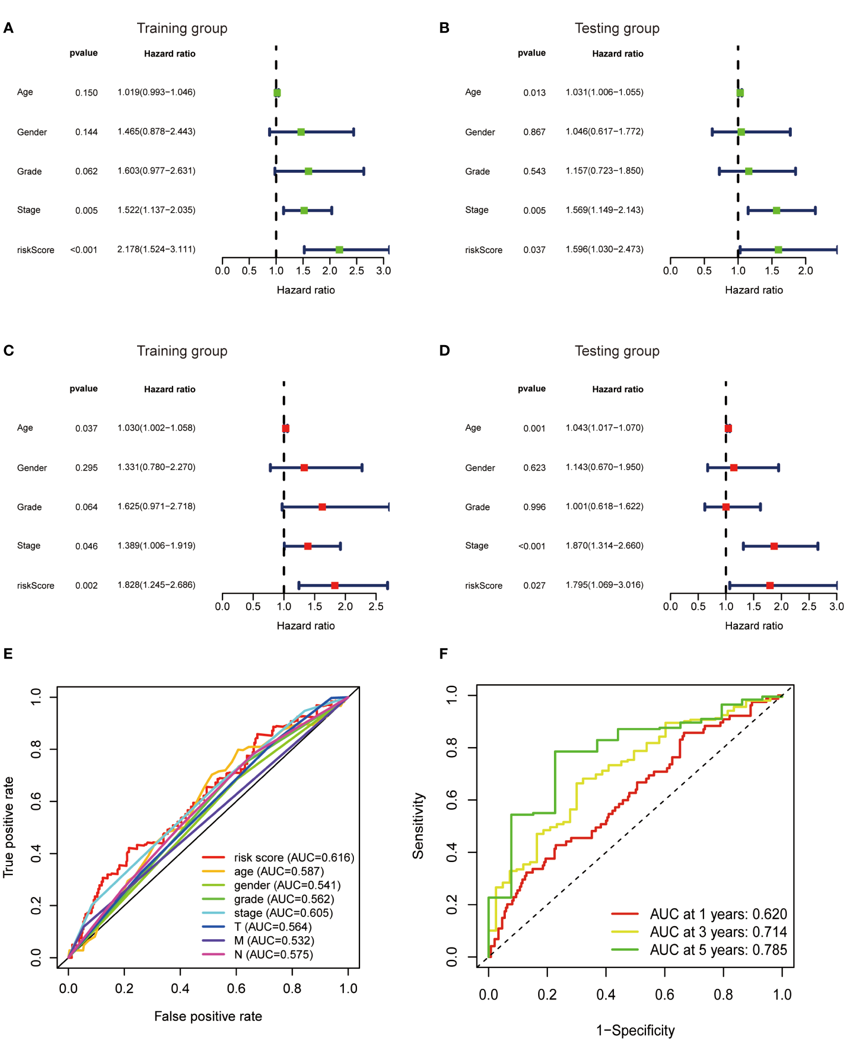 Metabolic lncRNAs risk score model was an independent prognostic factor. Univariate (A, B) and multivariate (C, D) Cox regression analysis of the association between clinicopathological features (including risk score) and OS of patients in the training and testing group. (E) The ROC curves of the risk score model and clinicopathological parameters (F) The ROC curves of the risk score model at 1-,3-,5-years.