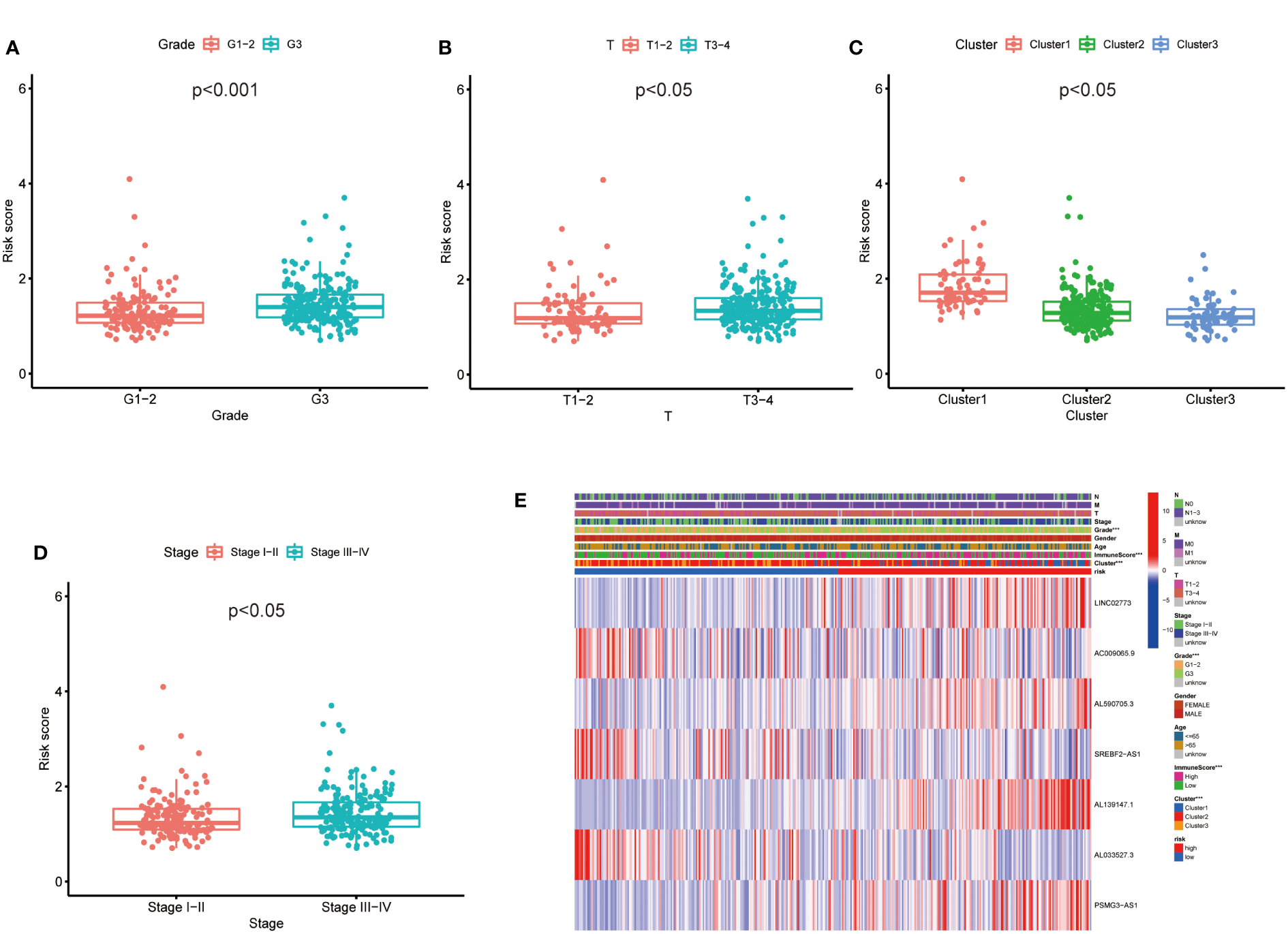 Then, we evaluated the correlation between the risk score and clinicopathological features of GC patients. The grade, tumor invasion depth, cluster pattern and TNM staging showed significant differences in the high- and low-risk groups (Figures 7A–D). The expression of the seven selected metabolic lncRNAs were varied, as shown in the heatmap, LINC02773, AL590705.3, AL139147.1 and PSMG3-AS1 were highly expressed, while AC009065.9, SREBF2-AS1 and AL033527.3 were expressed lowly in high-risk group(Figure 7E). Next, stratification analysis was performed to verify whether the risk score can maintain its prediction ability in each subgroup. The results showed the lncRNA risk score could further distinguish the survival difference among GC patients with same age, gender, grade, tumor invasion depth (T), lymph node metastasis (N), distal metastasis (M) and TNM staging (Figure 8; Figure S2).