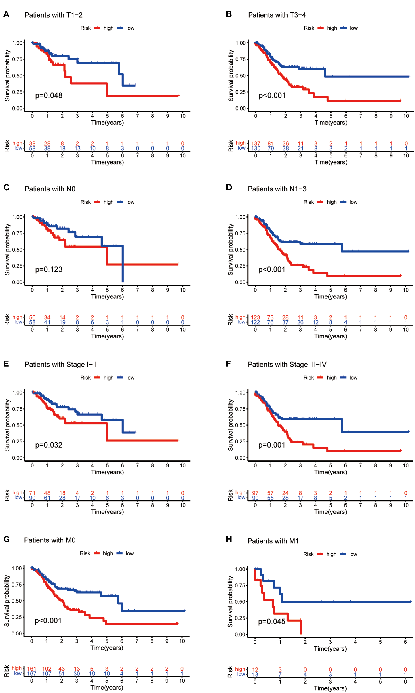 Kaplan-Meier curves of OS differences stratified by tumor invasion depth (T), lymph node matestasis (N), distinal metastasis (M) and TNM staging between the high- and low-risk groups.