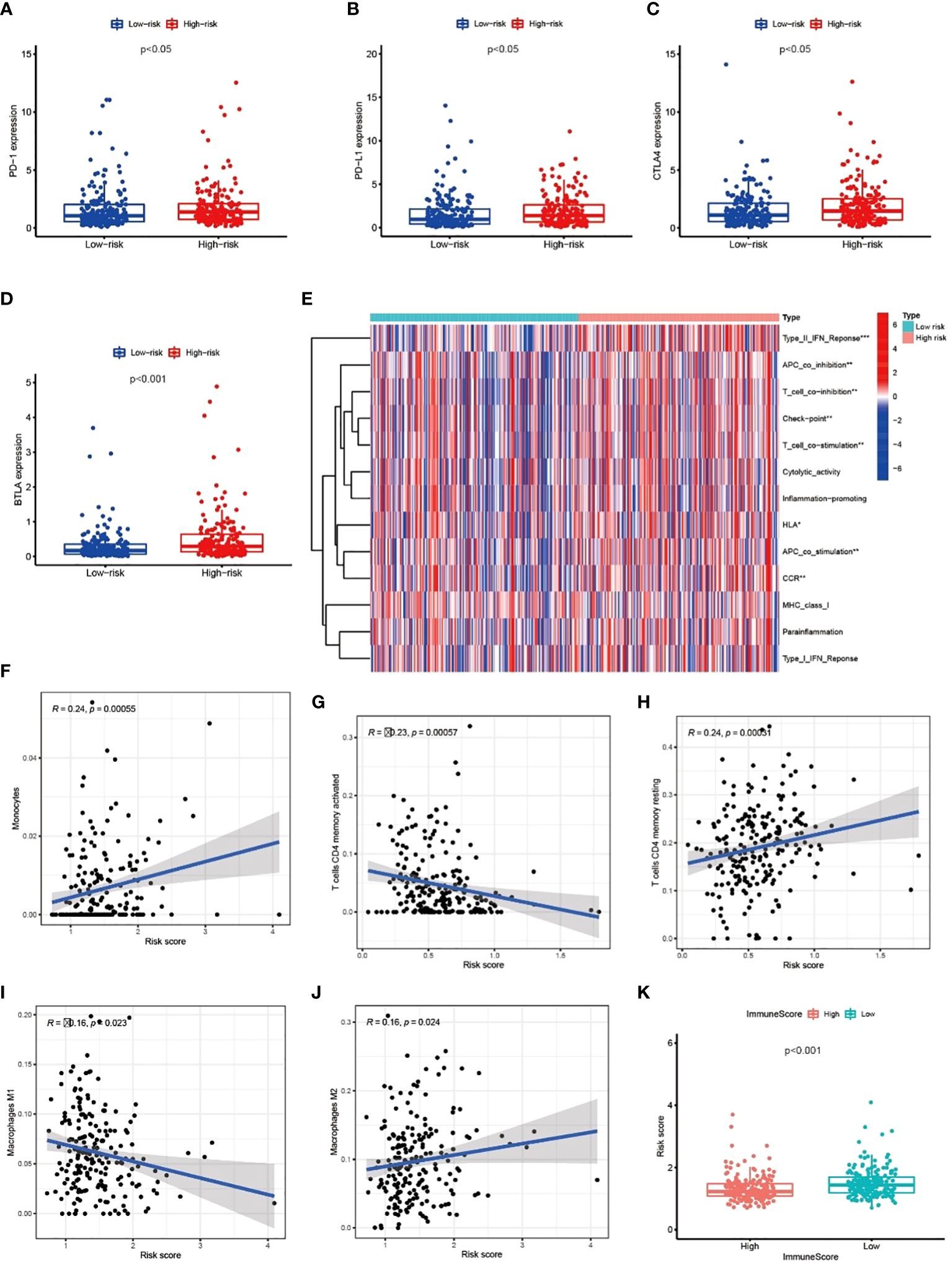 Metabolic lncRNAs risk model reflected the immune microenvironment (A–D) The relationship between immune checkpoint molecules and risk scores. (E) Heatmap of differences in immune function between high- and low-risk group. (F–J) The relationship between immune cell types and risk scores. (K) Boxplot of relationship analysis of risk score and ImmuneScore. *p < 0.05,**p < 0.01, ***p < 0.001.