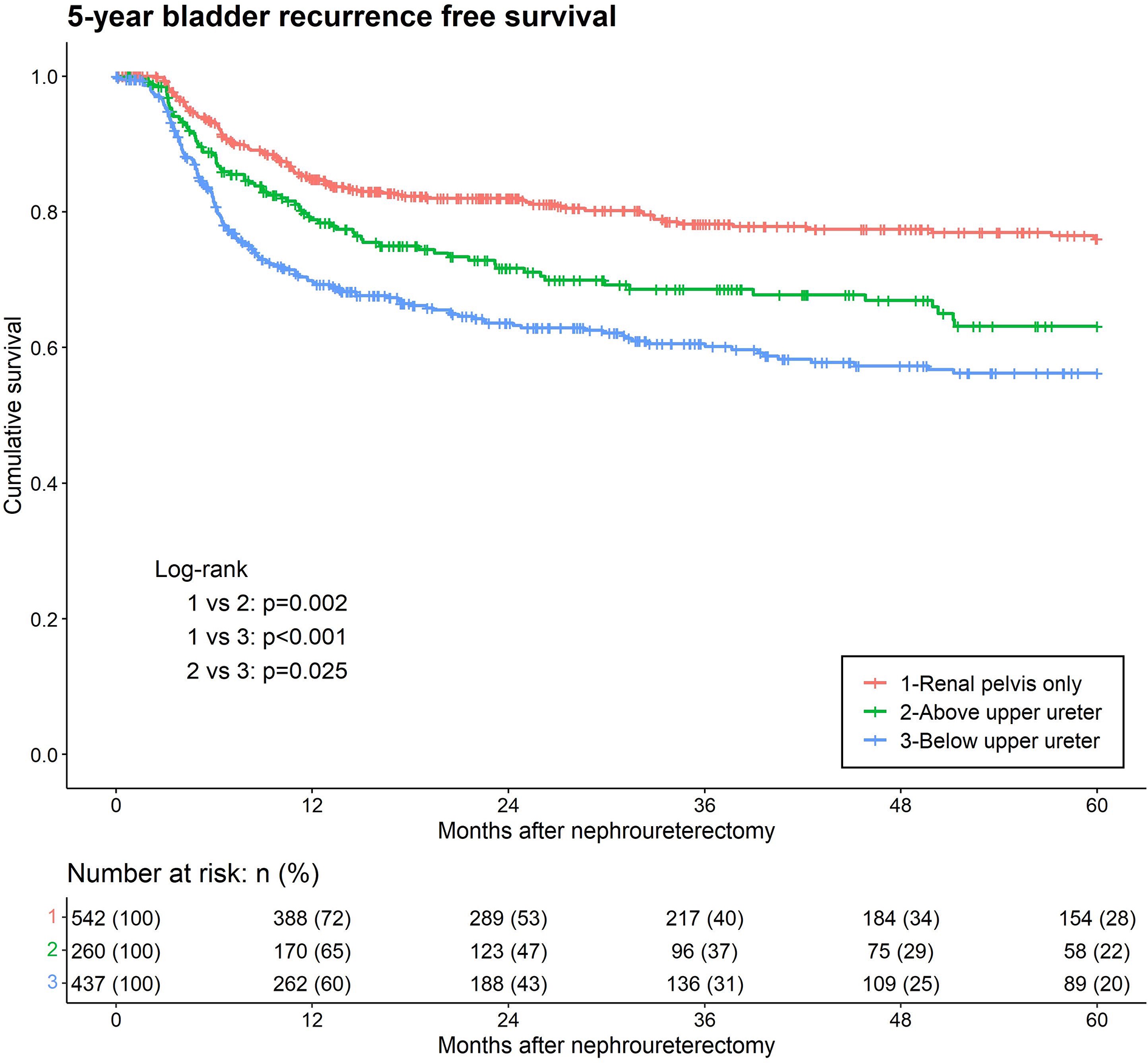 Kaplan-Meier analyses for 5-year intravesical recurrence-free survival stratified by the lowest level of tumor involvement among patients with upper tract urothelial carcinoma following rad-ical nephroureterectomy.