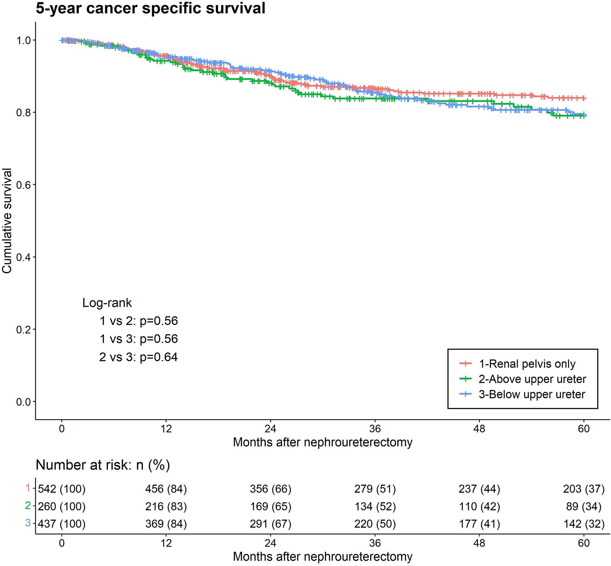 Kaplan-Meier analyses for 5-year cancer-specific survival stratified by the lowest level of tumor involvement among patients with upper tract urothelial carcinoma following radical nephroureterectomy.