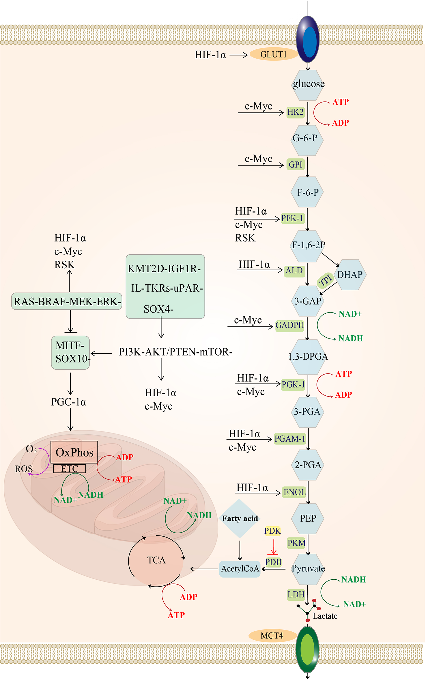 The MAPK (RAF-MEK-ERK) signaling pathway is frequently activated in melanoma (35), and it can phosphorylate the downstream p90 ribosomal S6 kinase (RSK) (36), which activates fructose-2,6-bisphosphatase 2 (PFKFB2), an isoform of phosphofructokinase, increasing fructose-2,6-bisphosphate synthesis (a glycolytic intermediate) (37). Additionally, RSK phosphorylates fructose-2,6-bisphosphatase 1-4 (PFKFB1-4), an isoform of phosphofructokinase, to upregulate phosphofructokinase 1 (PFK-1), a significant rate-limiting enzyme of glycolysis, which ultimately increases glycolytic flux (38, 39).The hypoxia-inducible factor (HIF1α) is a regulator of glycolysis, and its production is promoted by the activation of PI3K-PTEN/AKT and MAPK signaling pathways (40–42). The MAPK signaling pathway can inhibit the MITF-PGC1α axis, and the PI3K-PTEN/AKT signaling pathway indirectly stimulates the mammalian target of rapamycin (mTOR) protein. Both can increase downstream HIF-1α activity (43). Moreover, increased HIF-1α activity promotes the expression of enzymes involved in glycolysis, such as PFK, aldolase (ALD), 1,3-diphosphoglycerate phosphoglycerate kinase 1 (PGK1), enolase (ENOL) (44), as well as glucose transporter 1 (GLUT-1,GLUT-1 is one of the GLUT family of membrane transport proteins dedicated to intracellular glucose uptake) (45), ultimately increasing glucose uptake and glycolysis flux.