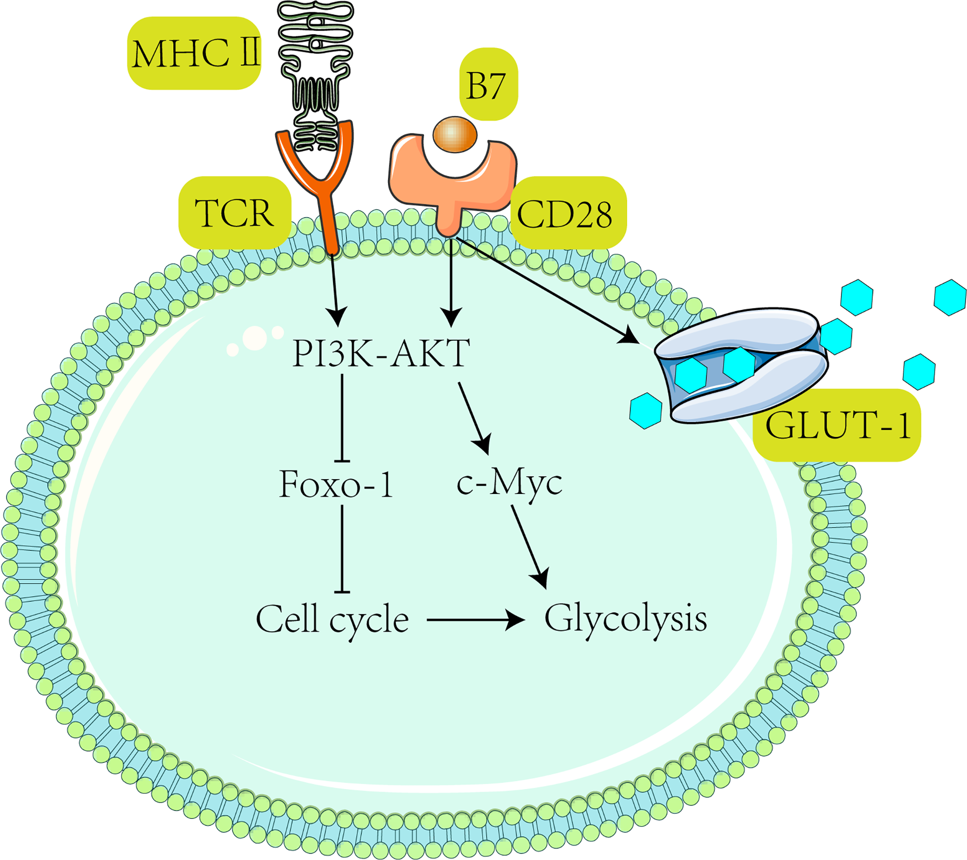 Activation of T cells requires receiving TCR and CD28-mediated co-stimulation, subsequently activating the PI3K-Akt pathway (47). After the PI3K-Akt pathway activates c-Myc, downstream Glut1 expression is stimulated to promote glycolysis (139) and T cell proliferation (146). It has been shown that activated T cells drive the PI3K-Akt-Foxo1 regulatory circuit (147, 148). Foxo1 (Forkhead box P1) is a transcriptional repressor of the T cell activation (147). Activation of AKT suppresses Foxo1 expression (149) and ultimately promotes T cell activation (47).
