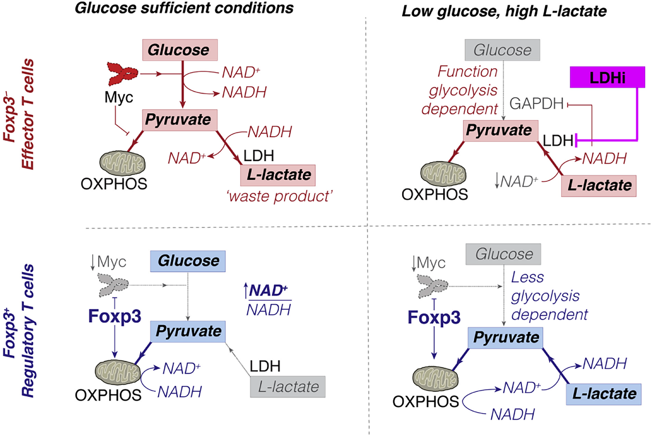 Conceptual model of how Foxp3+ Treg can escape the suppressive effects of low glucose, high L-lactate environments. Copyright © 2016 Elsevier Inc.