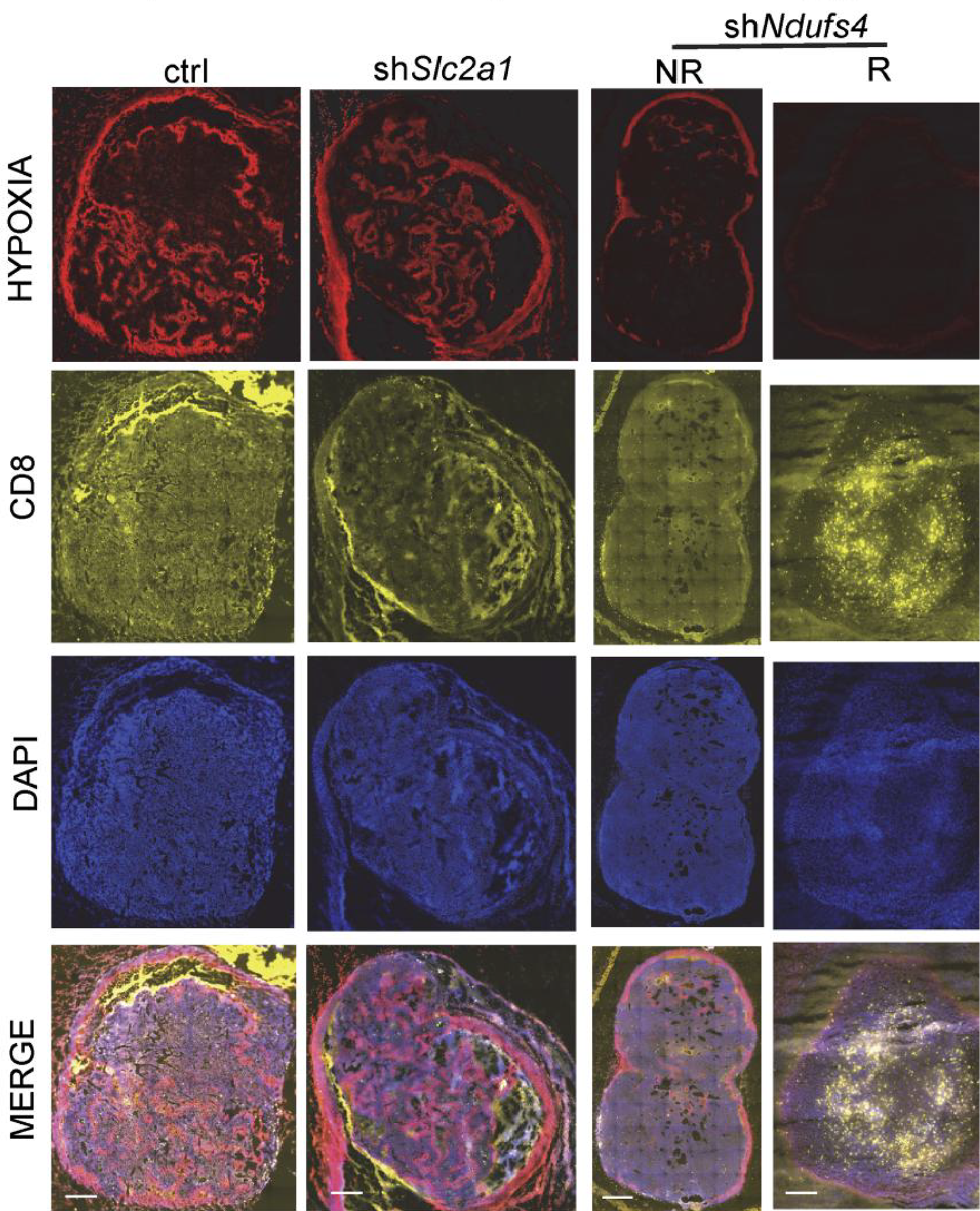 Hypoxia is present in the control group (elevated glycolysis, elevated oxidative phosphorylation) and the shSlc2a1 group (reduced glycolysis, elevated oxidative phosphorylation), while T cell accumulation in melanoma is low. The shNdufs4 group (glycolysis only) is less hypoxic, and the T-cell status is significantly improved. Copyright © 2019, American Society for Clinical Investigation.