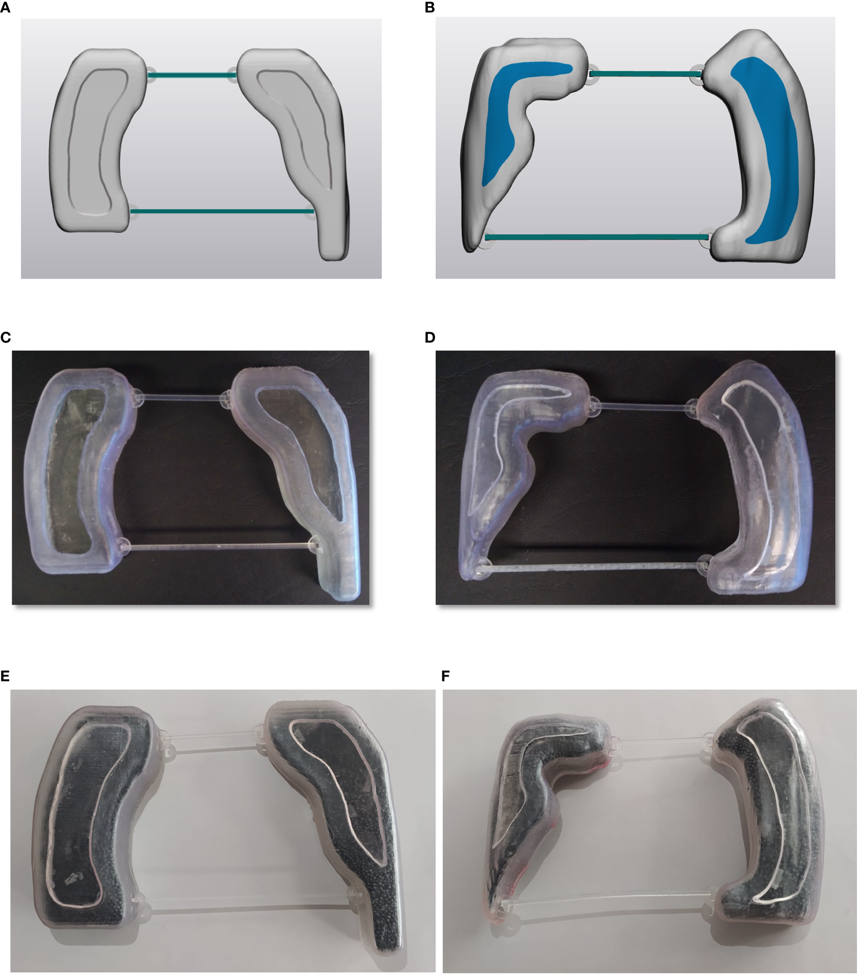 Panels (A, B) illustrate an example of digital lung blocks for supine and prone set-up, respectively, panels (C, D) show the hollow containers of 3D-printed lung blocks while panels (E, F) report the containers filled with lead spheres.