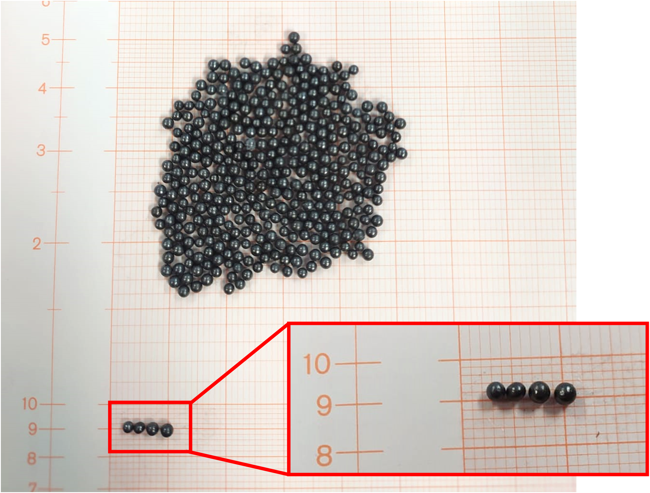 Lead spheres used to fill the 3D-printed allow lung blocks. Graph paper was used to point out the spheres dimension.