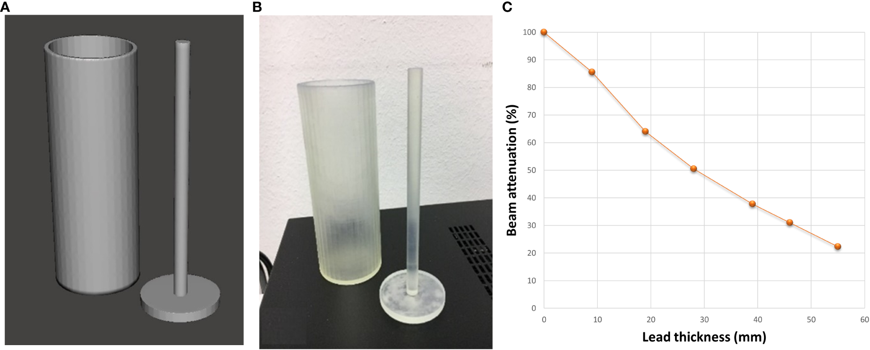 Digital (A) and 3D-printed (B) models of the ad-hoc cylinder used to determine the filling level of the lung blocks with lead spheres. (C) Photon diode-measured % beam attenuation against the thickness of cylinder filled with lead spheres.