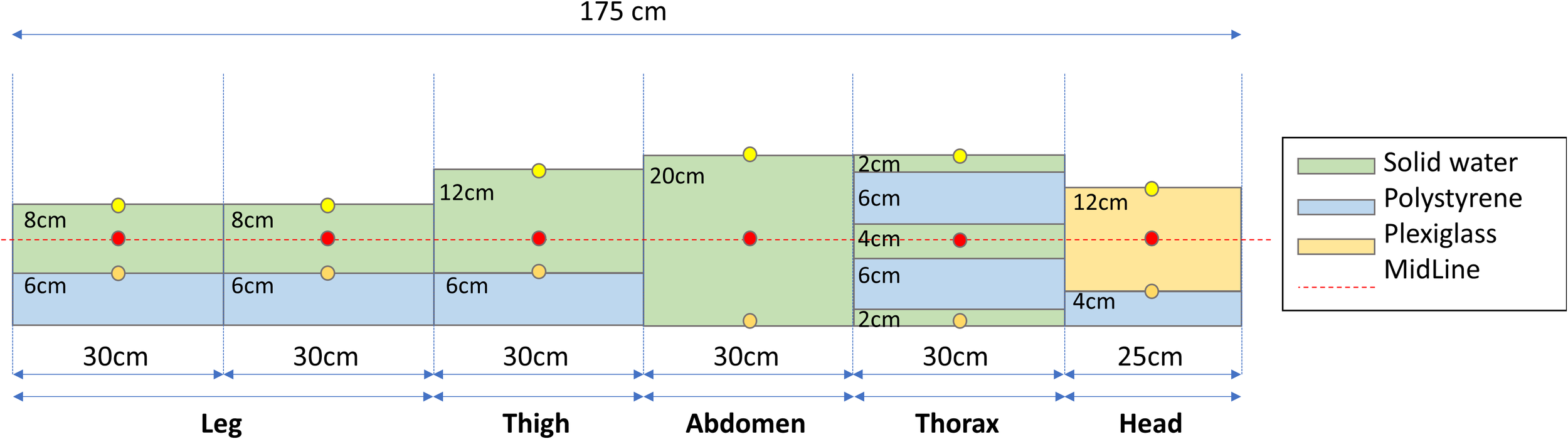 An ad-hoc phantom was created using different water-equivalent plastic slab phantoms to simulate an example patient. Circles indicate measurement points using the farmer at entrance (yellow), midline (red), and exit (orange) position.