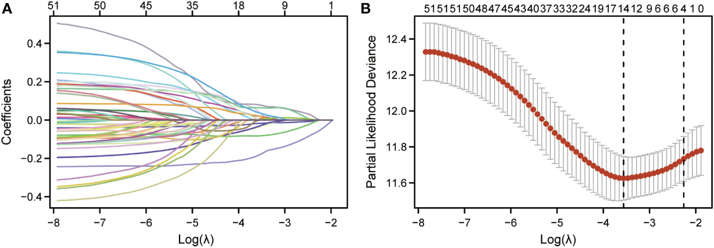 Identification of CCP-related genes in cutaneous melanoma and their biological functions. (A). LASSO coefficient profiles of 51 prognostic CCP-related genes. (B). Cross-validation for tuning parameter selection in the LASSO model.