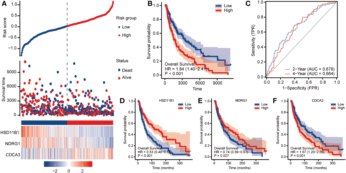 The cohort served as a validation cohort to assess the predictive effectiveness of the CCP-related gene signature. The patients in datasets were split into high-risk and low-risk groups using the same criteria by computing the risk scores for each patient using the algorithm indicated above. In the high-risk category, there were more fatal cases. High-risk patients consistently exhibited increased expression of HSD11B1 and NDRG1 and reduced expression of CDCA3 (Figure 3A). The distribution of this risk model in KM survival curves showed a significantly lower survival status for high-risk patients than for patients in the low-risk group (Figure 3B; HR=1.84, 95%CI=1.40-2.41, p<0.001). AUC values (AUC=0.678, 0.664) were found for the ROC curves of this risk model at two and four years, as shown in Figure 3C. For HSD11B1 (HR=0.53, 95%CI=0.40-0.69, P<0.001) and NDRG1 (HR=0.74, 95%CI=0.56-0.97, P=0.027), we found that low-RS patients had worse clinical outcomes than high-RS patients, however CDCA3 (HR=1.57, 95%CI=1.20-2.06, p=0.001) exhibited the exact opposite tendency (Figures 3D-F). DSS analysis produced the same results (Supplement Figure 2).