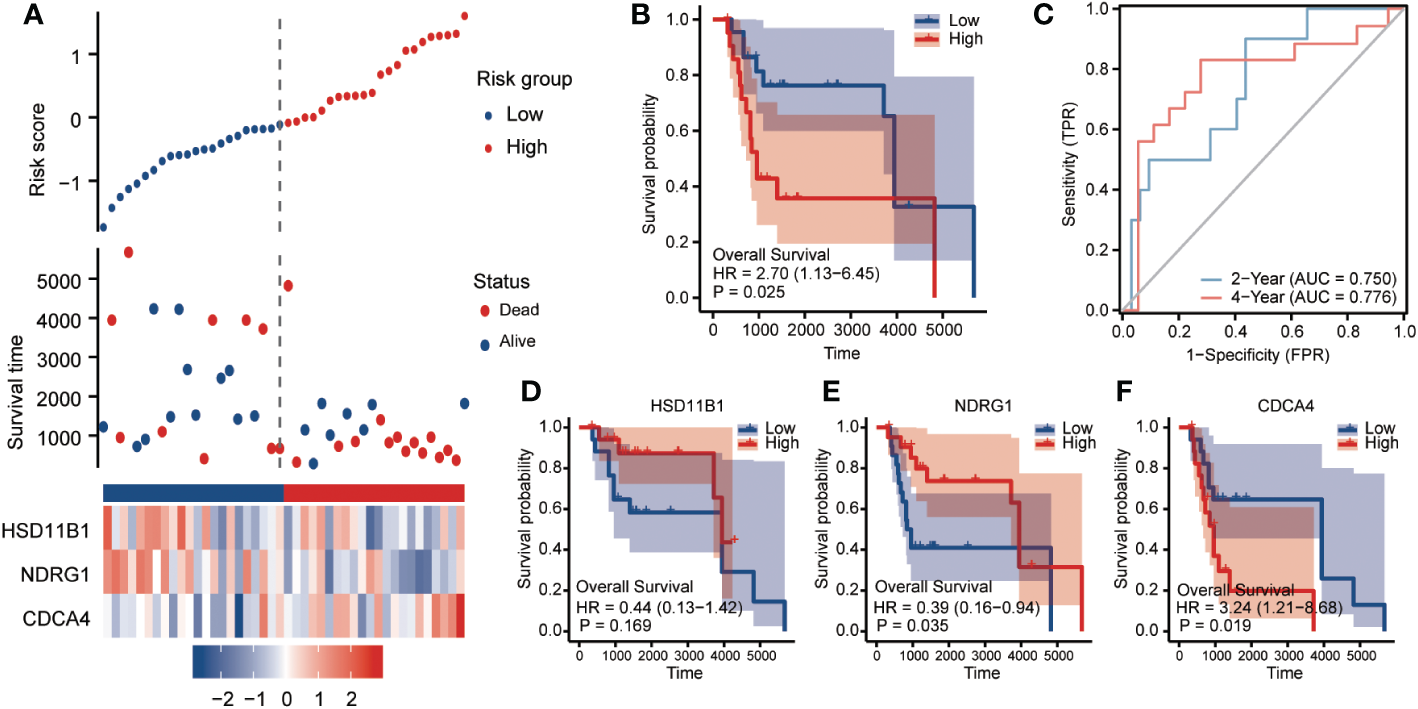 The risk signature in the GSE19234 dataset (n = 44) was then externally validated. Patients with cutaneous melanoma were divided into two groups based on the median RS. Patients in the high-risk group had considerably worse overall survival (OS) than those in the low-risk group, which was in line with the indings in the TCGA dataset (Figures 4A, B HR=2.7, 95%CI=1.13-6.45, p=0.025). In the testing set, the AUCs of the ROC curves for predicting the 2- and 4-year survival of PC patients were 0.75 and 0.776, respectively (Figure 4C), We observed that individuals with a low RS had poorer clinical outcomes than those with a high RS for HSD11B1 (HR=0.44, 95%CI=0.13-1.42, P=0.169) and NDRG1 (HR=0.39, 95%CI=0.16-0.94, P=0.035). However, CDCA3 (HR=3.24, 95%CI=1.21-8.68, P=0.019) displayed the exact opposite tendency, which was consistent with TCGA set results (Figures 4D-F).