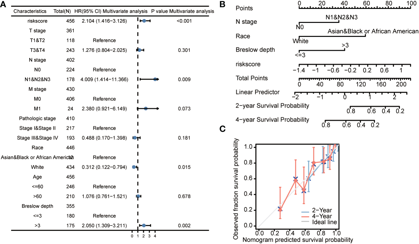 The prognostic value of CCP-related genes (overall survival) in diverse cutaneous melanoma (A). Forrest plot of multivariate Cox regression analysis. (B). Nomogram integrating risk score based on 3 CCP-related genes, N stage, race, and Breslow depth. (C). Calibration plots of the nomogram for evaluating the probability of OS at 2 and 4 years. OS, overall survival.