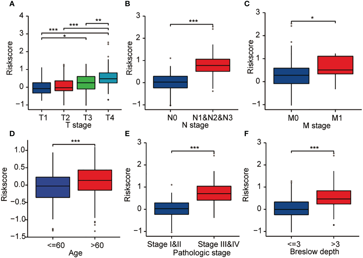 Concurrently, additional studies were conducted on the relationship between patient clinicopathological data and the expression of CCP-related genes. As demonstrated in Figures 6A-F, higher expression level of CCP-related genes was significantly related to T stage (T1 vs. T4, P < 0.001), N stage (N0 vs. N1&N2&N3, P < 0.001), M stage (M0 vs. M1, P < 0.05), age (<=60 vs. >60, P < 0.001), pathologic stage (stageI&II vs. stageIII&IV, P < 0.001), and Breslow depth (<=3 vs. >3, P < 0.001) (Figure 6).