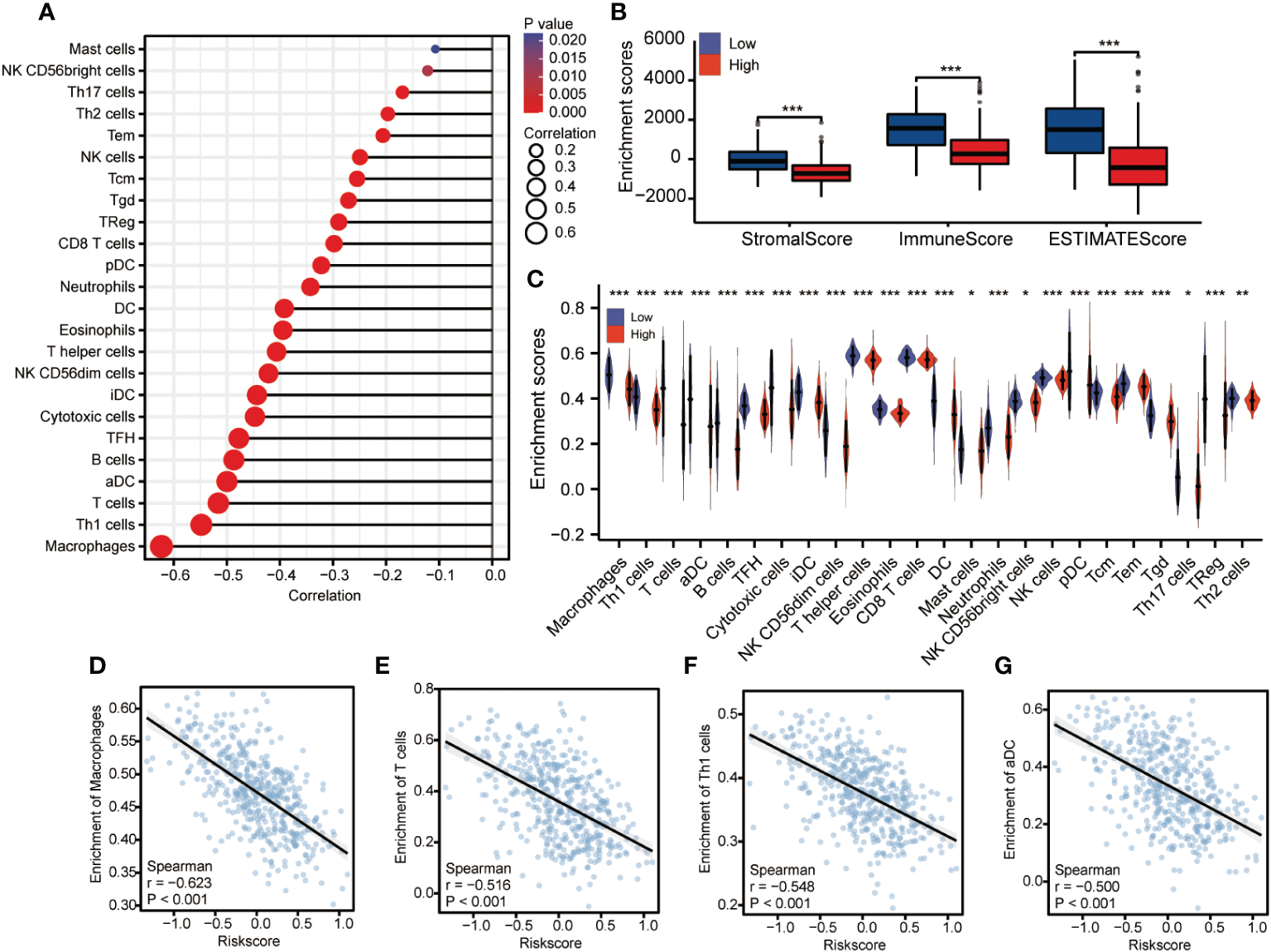 Correlation analysis of the expression of CDCA3 and immune cell infiltration. (A) The abundance ratio of the 22 types of immune cells in the entire TCGA set. (B) Differences in immune scores between high and low CDCA3 expression groups. (C) Differential immune cell type abundance between high and low CDCA3 expression groups. (D–G) Correlation diagrams and scatter plots indicating differences in themacrophage, T cell, Th1 cell, and aDC infiltration levels between the high and low CDCA3 expression groups. *p < 0.05; **p < 0.01; ***p <0.001; NS, no significance.