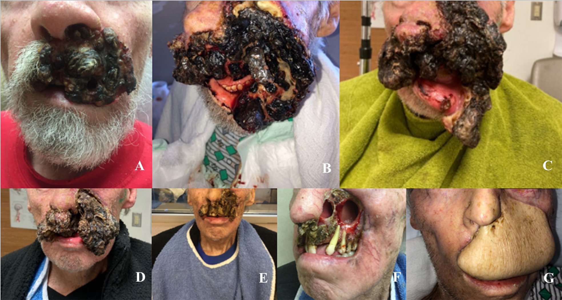 (A-G) Lesion During Treatment Progression: (A) August 2020, First presentation to dermatology; (B) November 6, 2020, prior to initiating cemiplimab; (C) December 4, 2020, after 1 cycle of cemiplimab; (D) December 22, 2020, after 2 cycles of cemiplimab and 1 cycle of QuadShot radiotherapy; (E) January 14, 2021, after 3 cycles of cemiplimab and 2 cycles of QuadShot radiotherapy; (F) February 11, 2021, after 4 cycles of cemiplimab and 2 cycles QuadShot radiotherapy; (G) October 2021, after debulking and reconstruction.
