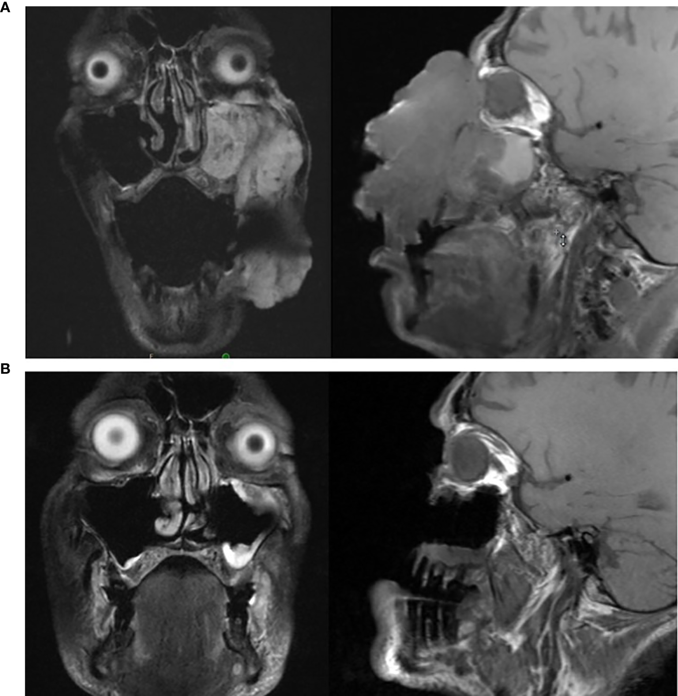 Cemiplimab was initiated on November 8, 2020. On November 23, 2020, the patient presented to the emergency department (ED) with an increase in the size of his facial mass and bleeding. This was assumed to be a flare (pseudoprogression) after immunotherapy. Radiation oncology recommended QUAD shot radiotherapy (RT) with 14 Gy, delivered in 4 fractions (twice per day for 2 days) every 3 weeks for 4 cycles. The lesion shrunk between the CT simulation and the radiation initiation and became drier. Cycle 1, day 1 QUAD shot was completed on November 30, 2020 (Figure 2C). Cycle 2 Day 2 cemiplimab was given on December 3, 2020. Following the second dose of cemiplimab + first radiation cycle, the lesion decreased by 75% with significant improvement from disease involvement near the eye. Cycle 2, day 1 QUAD shot was given on December 17, 2020 (Figure 2D), and cycle 3, day 1 cemiplimab was given on December 23, 2020. There was a further 75% reduction in the size of the mass (Figure 2E), but the patient developed grade-2 hypothyroidism. Radiation was then held after 50% of the dose was delivered. Following cycle 4 of cemiplimab, with cycle 4, day 1 on January 4, 2021, the patient developed two fistulas in his maxillary sinus and nasal cavity, which were determined to be sites of disease regression (Figure 2F). A facial MRI from January 27, 2021 revealed near-complete regression of the tumor in the inferior orbit (Figure 3B), indicating the patient may be able to avoid left orbital exenteration, which would have been indicated prior to ICI treatment. Cemiplimab was held on February 4, 2021 prior to cycle 5 of cemiplimab due to grade-1 transaminitis. The patient’s AST and ALT levels improved after treatment was held. Four biopsies were taken across the lesion on February 4, 2021, revealing no evidence of residual cancer. As his disease had significantly regressed, the care team felt that the patient had reached the point of maximal response. To salvage as much viable tissue as possible, the patient was referred to surgery for debridement of necrotic tissue and reconstruction (Figure 2G).