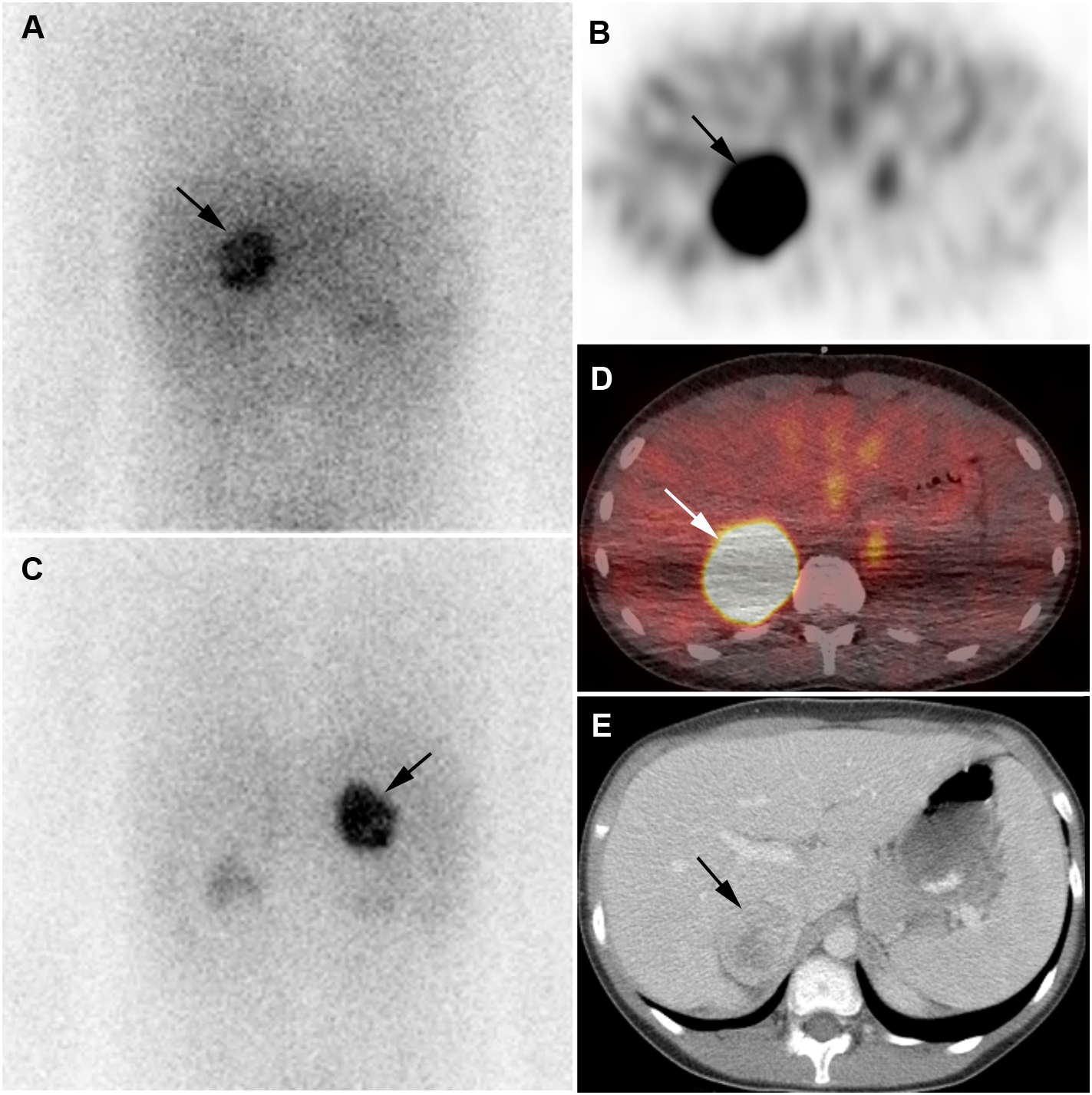Pheochromocytoma. 11-year-old boy with pheochromocytoma. [123I]I-mIBG anterior planar image (A), transverse [123I]I-mIBG SPECT (B), [123I]I-mIBG posterior planar image (C), Fusion [123I]I-mIBG SPECT/CT (D), Diagnostic CT (E). Intense uptake of [123I]I-mIBG in right adrenal mass (arrows).