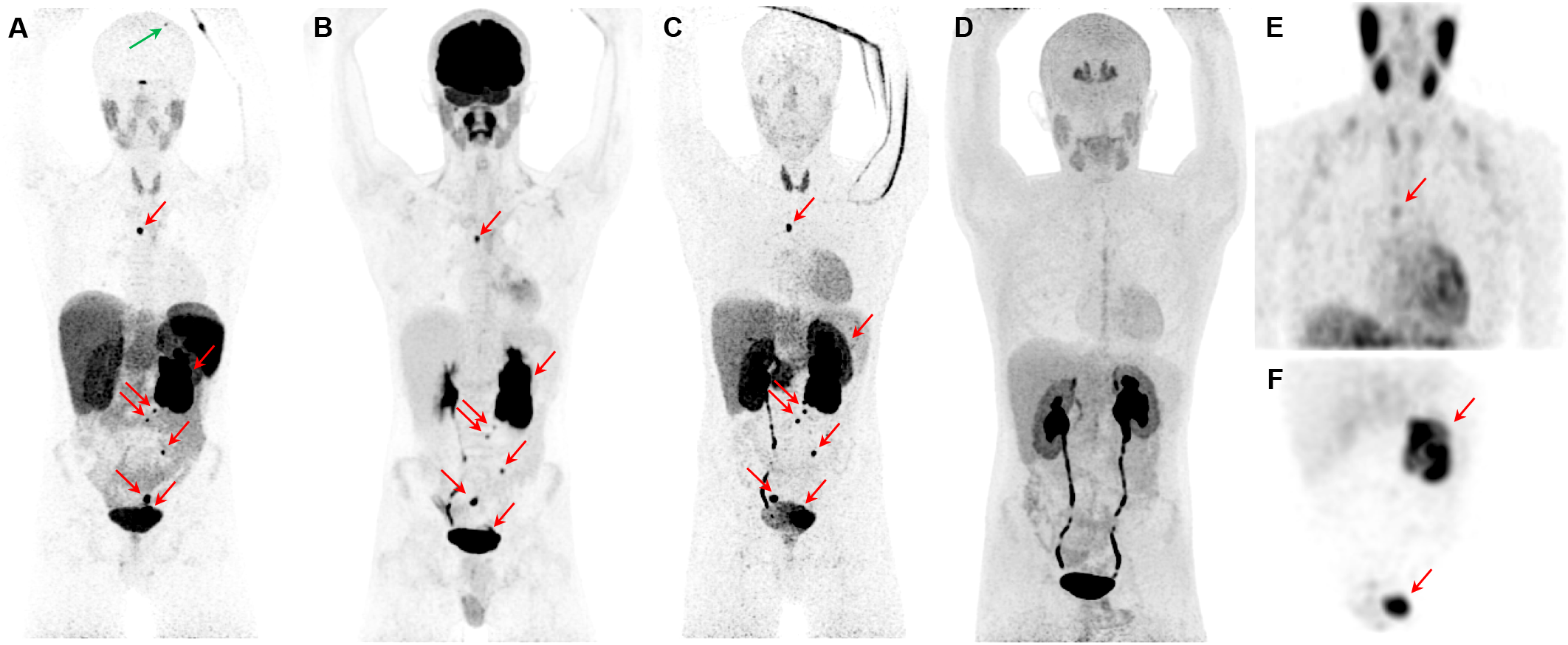 Metastatic pheochromocytoma. The maximum intensity projection images of [68Ga]Ga-DOTATATE PET (A), [18F]FDG PET (B), 18F-fluorodopamine ([18F]FDA) PET (C), 6-[18F]FDOPA PET (D), and [123I]I-mIBG SPECT/CT (E, F) of a 16-year-old boy with metastatic PPGL carrying a germline mutation in SDHB gene demonstrates a 5.7-cm left lesion in the adrenal/periadrenal region abutting the left upper renal pole along with lesions in the abdomen, mesentery, left peri-rectal and precarinal (red arrows) regions, and skull (green arrow). The [68Ga]Ga-DOTATATE PET detects an additional lesion in skull bone (blue arrow); however, 6-[18F]FDOPA failed to detect any lesions.