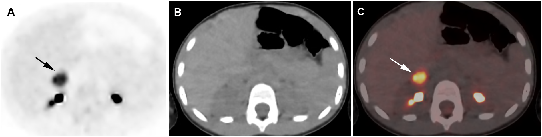 Adrenocortical adenoma. 5-year-old girl with history of neuroblastoma 4 years earlier. Suspected recurrence of neuroblastoma. Adrenal lesion noted on ultrasound as part of an evaluation of the urinary tract. [18F]FDG PET shows uptake in a right adrenal mass. Surgical resection of 2.5-cm adrenal adenoma. Transverse PET (A), CT (B), PET/CT fusion image (C). Intense [18F]FDG uptake in a right adrenal mass (arrows).