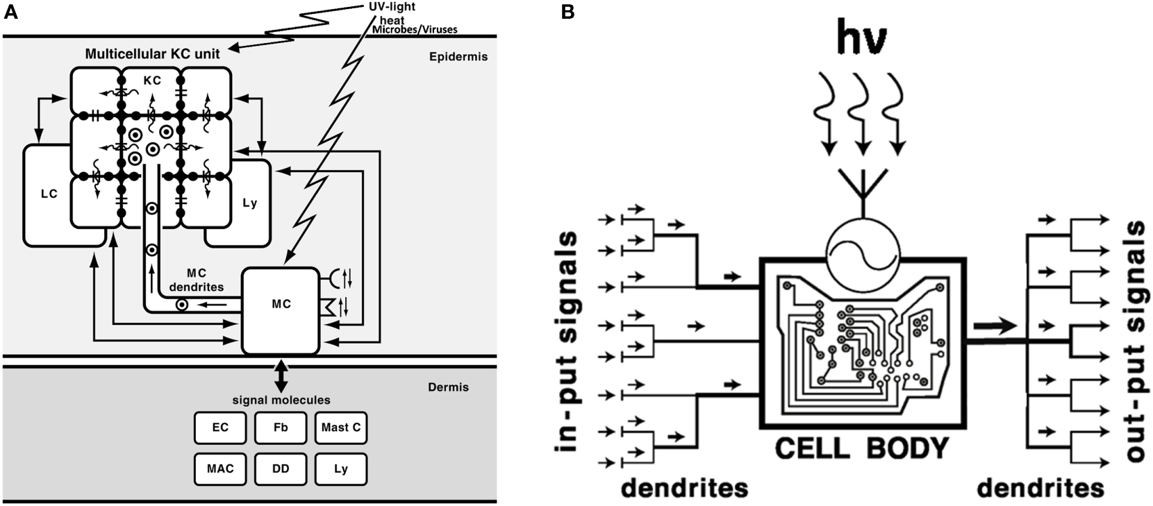 Melanocytes, melanin-producing cells with neuroendocrine capabilities, act as sensory and regulatory cells of the epidermis (A) with computing capabilities (B). (A): MC, melanocytes; KC, keratinocytes; LC, Langerhans cells; Ly, lymphocytes; Mast C, mast cells; MAC, macrophages; Fb, fibroblasts; EC, endothelial cells; DD, dermal dendritic cells;