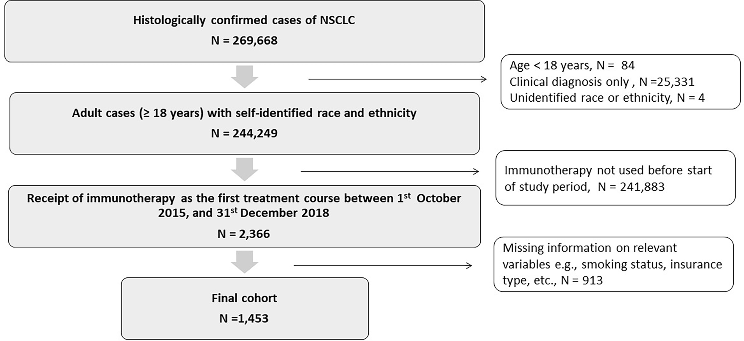 We identified patients with NSCLC, aged 18 years and above, who received immunotherapy as the first-line of treatment from October 2015 to December 2018. Patients were retrospectively followed till December 2020. Patients were excluded if they had any missing values for race, ethnicity, or any other study variables (Figure 1). The third edition of the International Classification of Diseases for Oncology (ICD-O) codes was used to identify cases of NSCLC, based on the primary site of the cancer, its morphology, and behavior (Table S1) (30, 32).