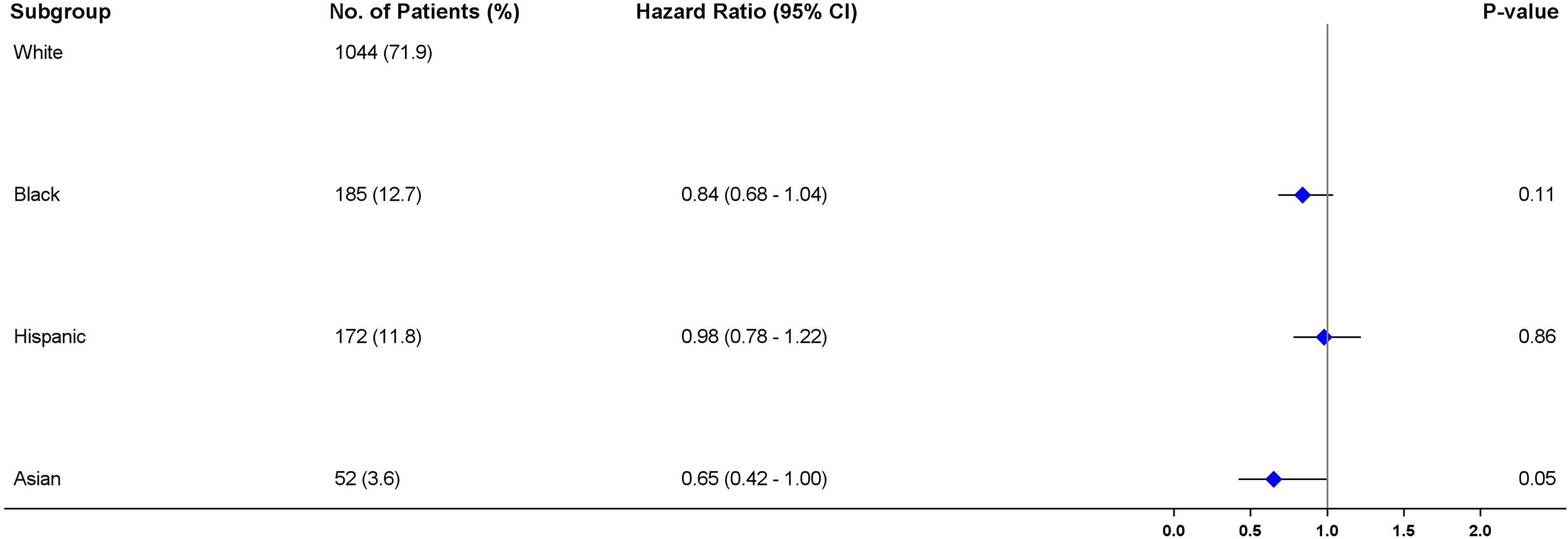 A total of 1453 patients were included in the analysis. Median survival (in months) was longest among Asians (34, 95% CI: 15-Not Estimable), followed by African Americans (AAs) (23, 95% CI: 15-34), Hispanics (22, 95% CI: 16-26), and Whites (19, 95% CI: 17-22). The adjusted regression estimates had no statistically significant differences in survival among AAs (aHR = 0.97; 95% CI = 0.78-1.20; P =0.77) and Hispanics (aHR = 0.96; 95% CI = 0.77-1.19, P =0.73) when compared to White patients. Asians on the other hand, had 40% reduction in mortality risk compared to Whites (aHR = 0.60; 95% CI = 0.39-0.94, P = 0.03).