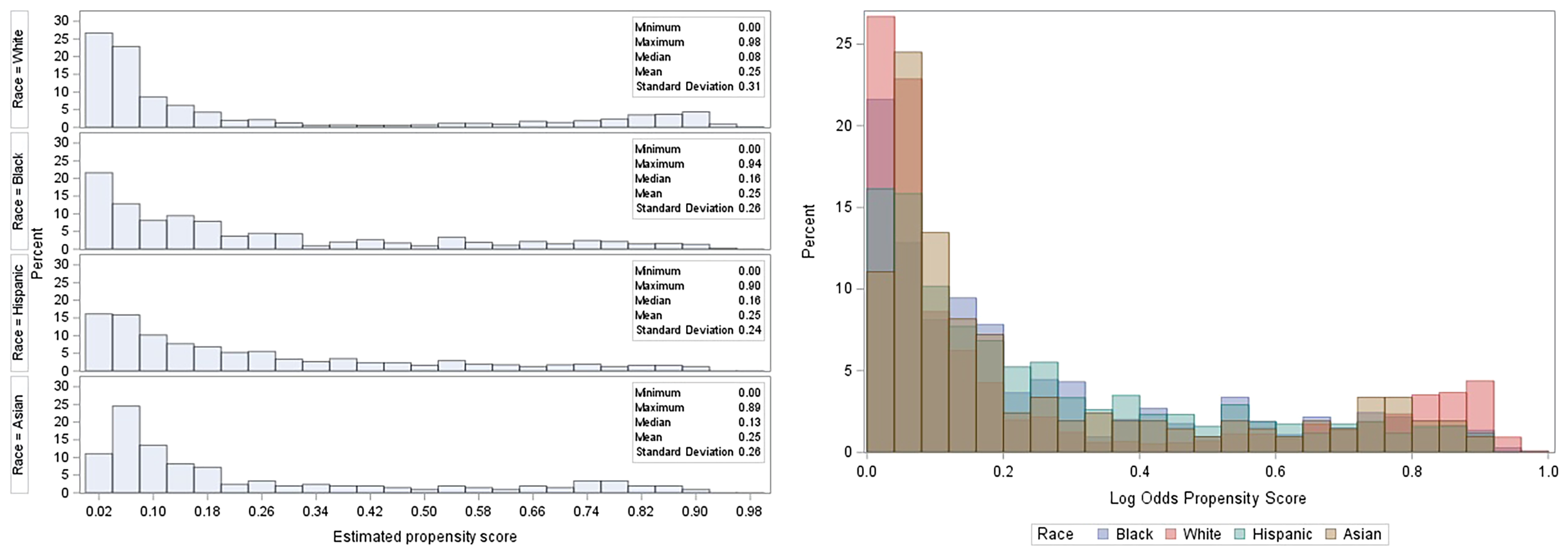 Histogram showing the distribution of propensity scores by treatment (racial) group. From L to R: stacked histogram showing individual propensity scores for treatment groups, the overlap of propensity scores among treatment groups.