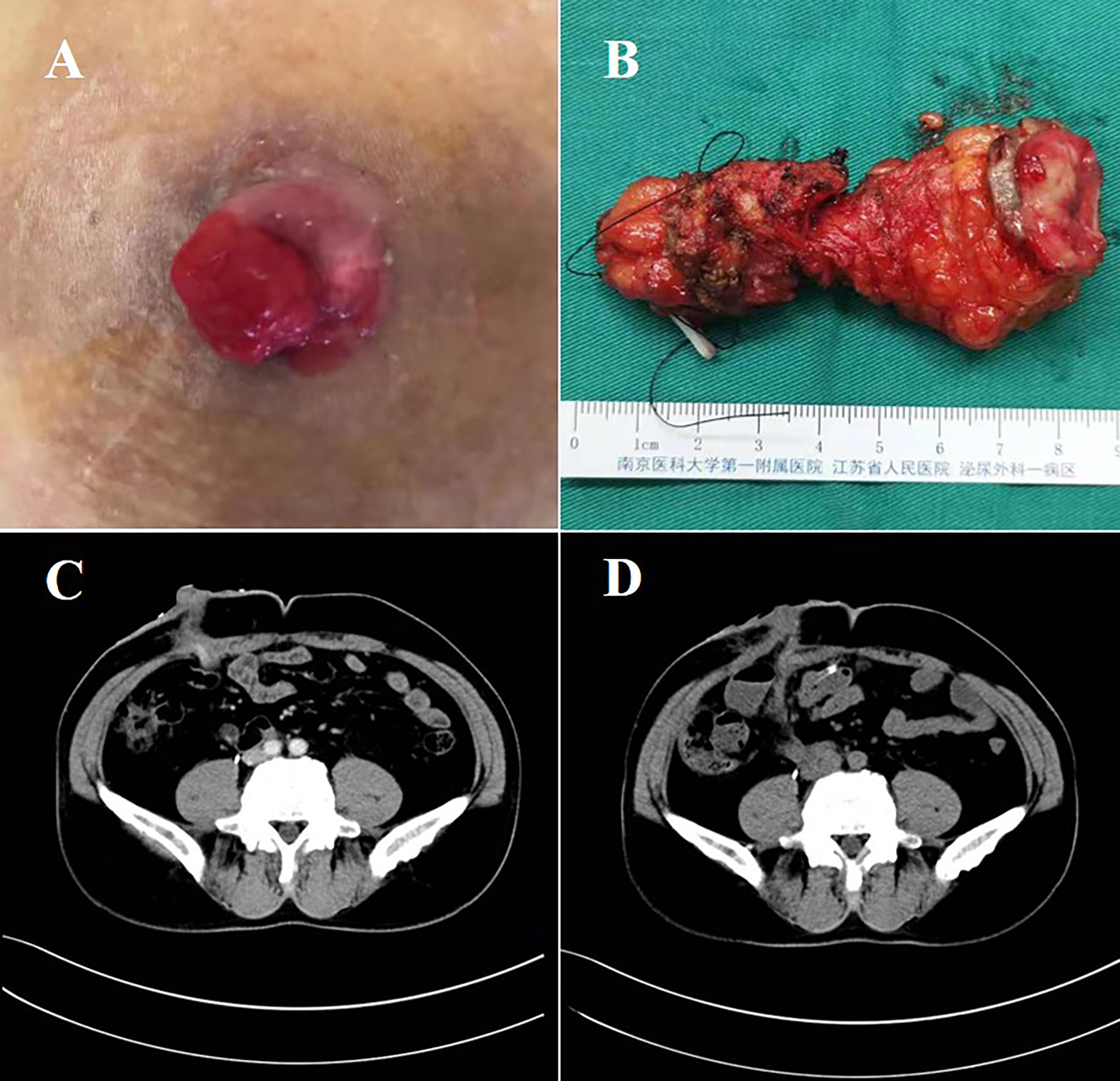 Surgical specimens and CT images. (A) The stoma mass of the patient before surgery. (B) The resected ureter after surgery. (C) CT image of the patients’ stoma mass before surgery. (D) CT image of the patients’ abdominal organs after surgery. CT, computed tomography.