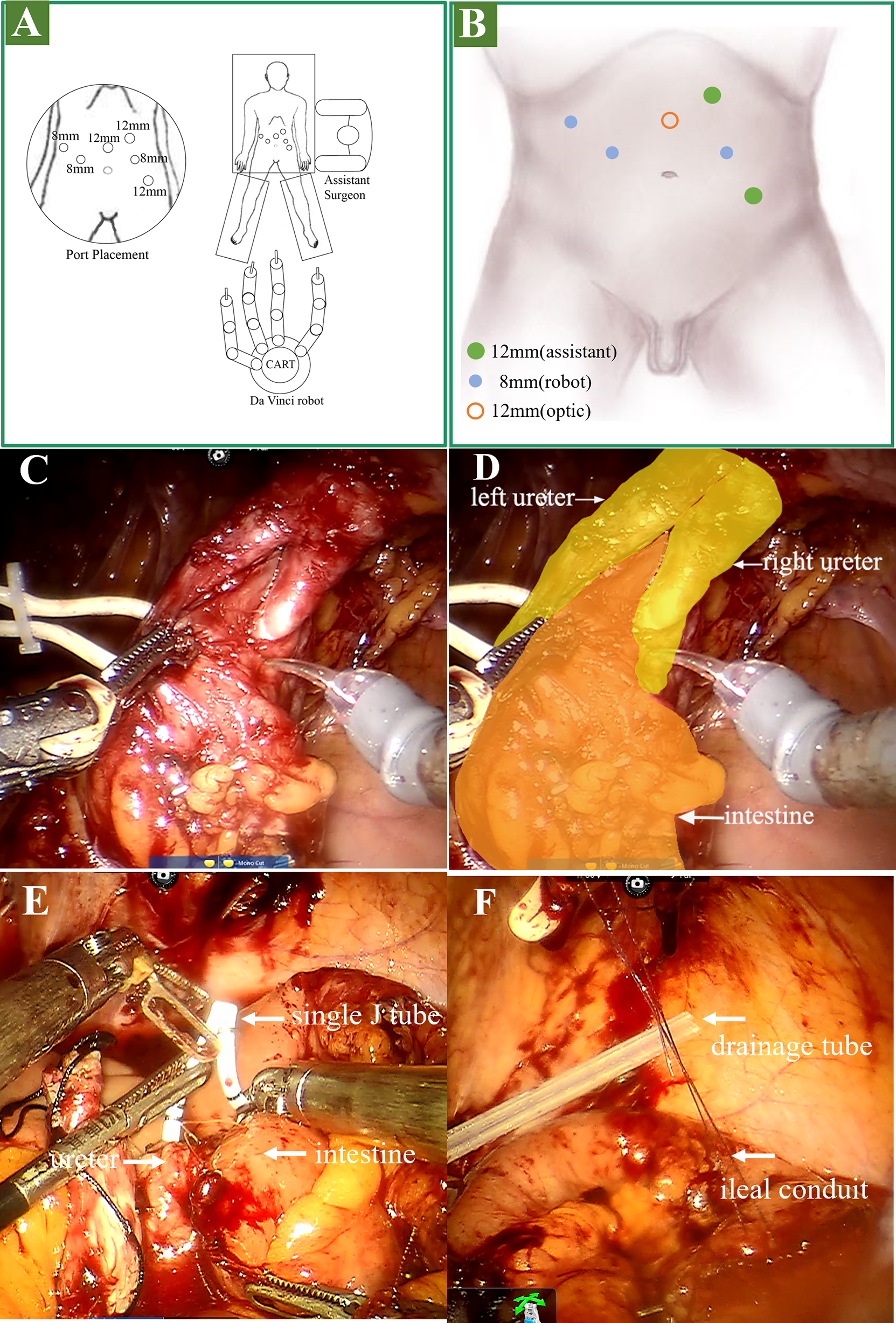 Operation procedure. (A, B) stage 1 surgical position and port placement. (C, D) stage 2: lysis of adhesions and dissociation of the ureter. (E) stage 3: placed the single J stent. (F) stage 3: suspended the outlet of the ileal conduit to the stoma.
