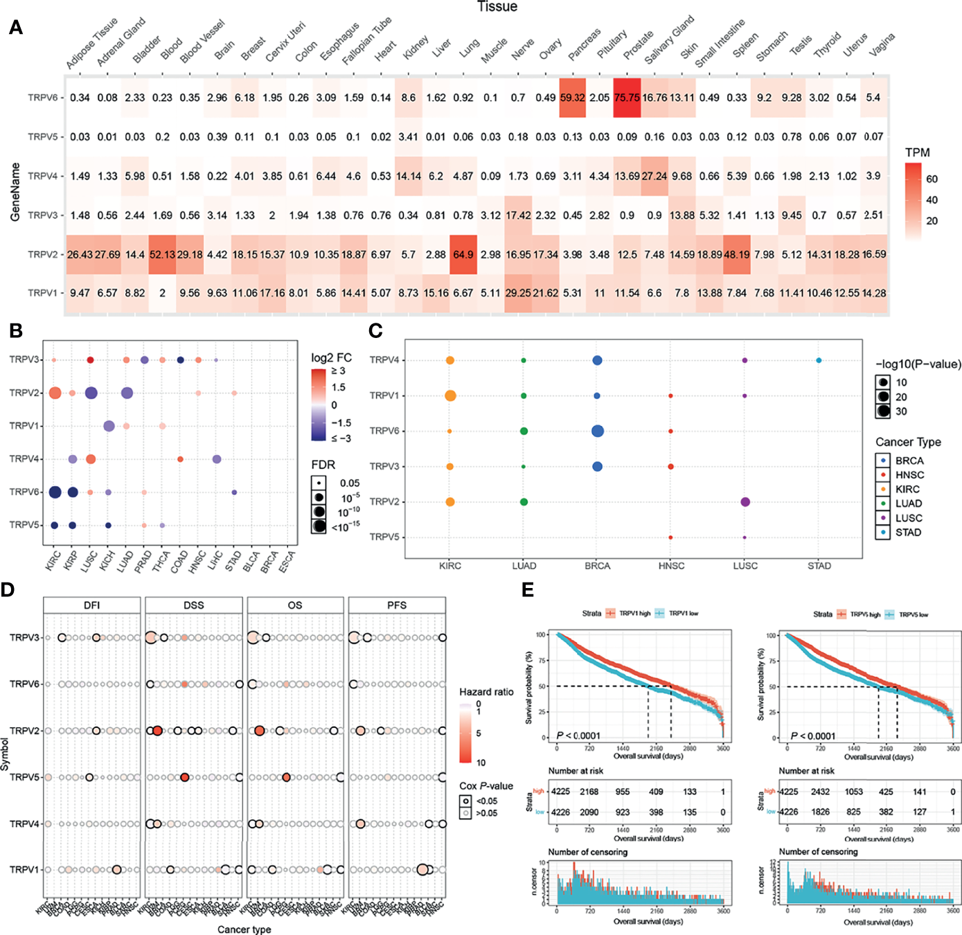 TRPV and subtype analysis of gene expression. (A) The heat map shows the expression profiles of the TRPV regulators in the GTEx dataset. (B) Significant differences in mRNA expression between normal and tumors in TCGA database. (C) Changes in mRNA expression in different cancer subtypes. (D) Survival analysis of TRPV regulators. The size of the dots represents the significance of the gene’s influence on survival for each cancer type,and the statistical significance of differences was determined by cox regression analysis. (E) TRPV1 and TRPV5 high expression contributes to the prognosis of cancer. All the significant differential expressed genes are shown in the figure.