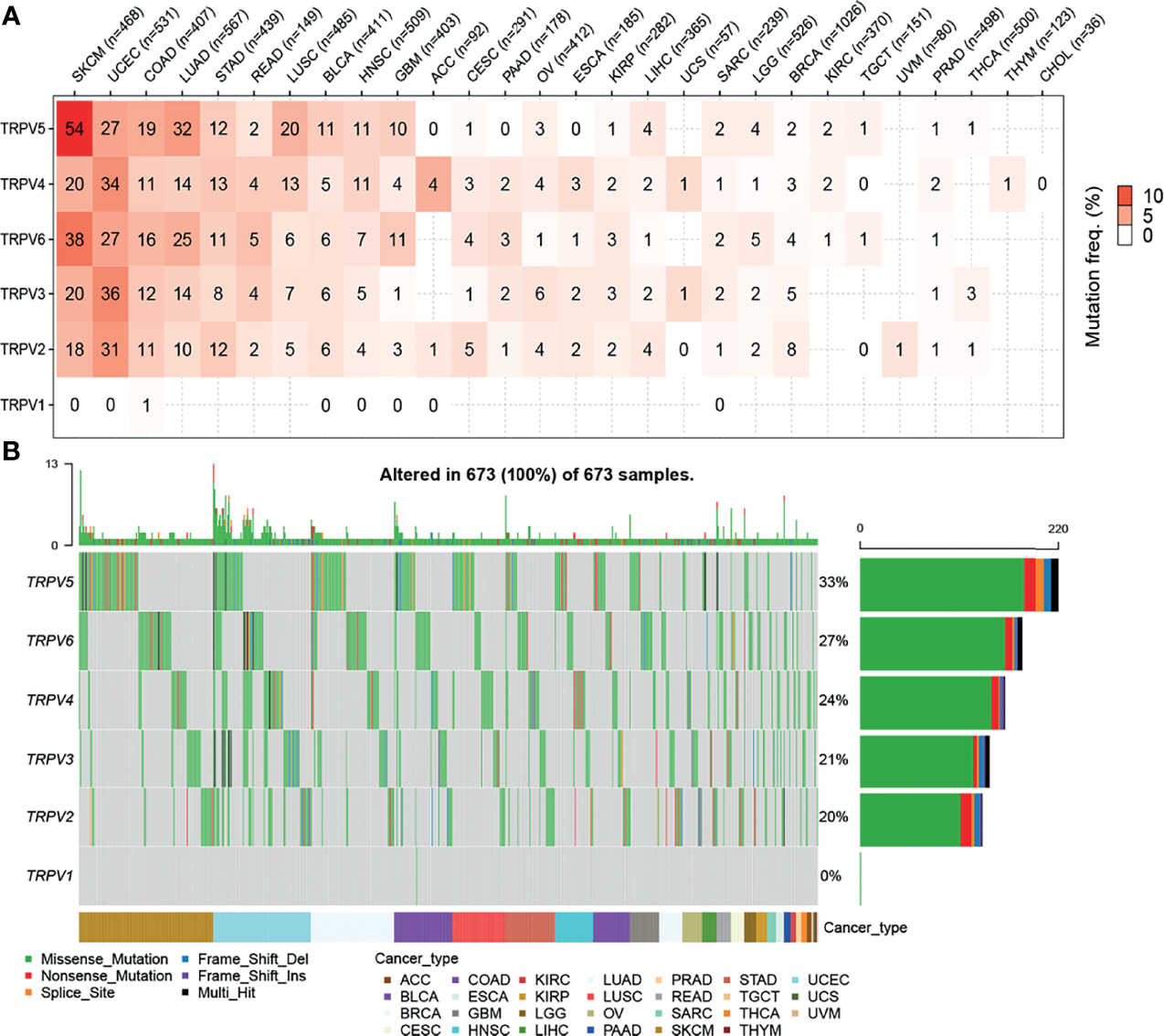 Single nucleotide variation (SNV) frequency and variant mutation types of TRPV channels. (A) Mutation frequency of TRPV channels. Numbers represent the number of percentages that have the corresponding mutated gene for a given cancer. The number ‘0’ indicates that there was no mutation in the gene coding region, and the blank space indicates that there was no mutation in any region of the gene. (B) SNV waterfall plot showing the mutation distribution of TRPV channels and a classification of variant SNV types.