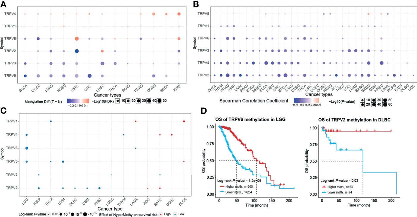 Methylation and survival of each TRPV channel-related genes. (A) Differential methylation in TRPV channels between tumor (T) and normal (N) samples in each cancer. Red dots represent increased methylation in tumors and blue dots represent decreased methylation in tumors. The darker the dot color, the larger the difference in methylation level. (B) Correlation between methylation and mRNA gene expression. Red points represent a positive correlation, and blue dots represent a negative correlation. The darker the dot color means the stronger the correlation. (C) Survival difference between TRPV regulators with high and low methylation levels and samples. Red dots represent worse survival of the hypermethylation group; blue dots represent the opposite. The dot size represents the statistical significance, the larger the dot size means, the higher the statistical significance. (D) Prognosis analysis of TRPV6 methylation status in brain lower grade glioma (LGG) and TRPV2 methylation in the lymphoid neoplasm, diffuse large B-cell lymphoma (DLBC). P < 0.05; FDR, false discovery rate.