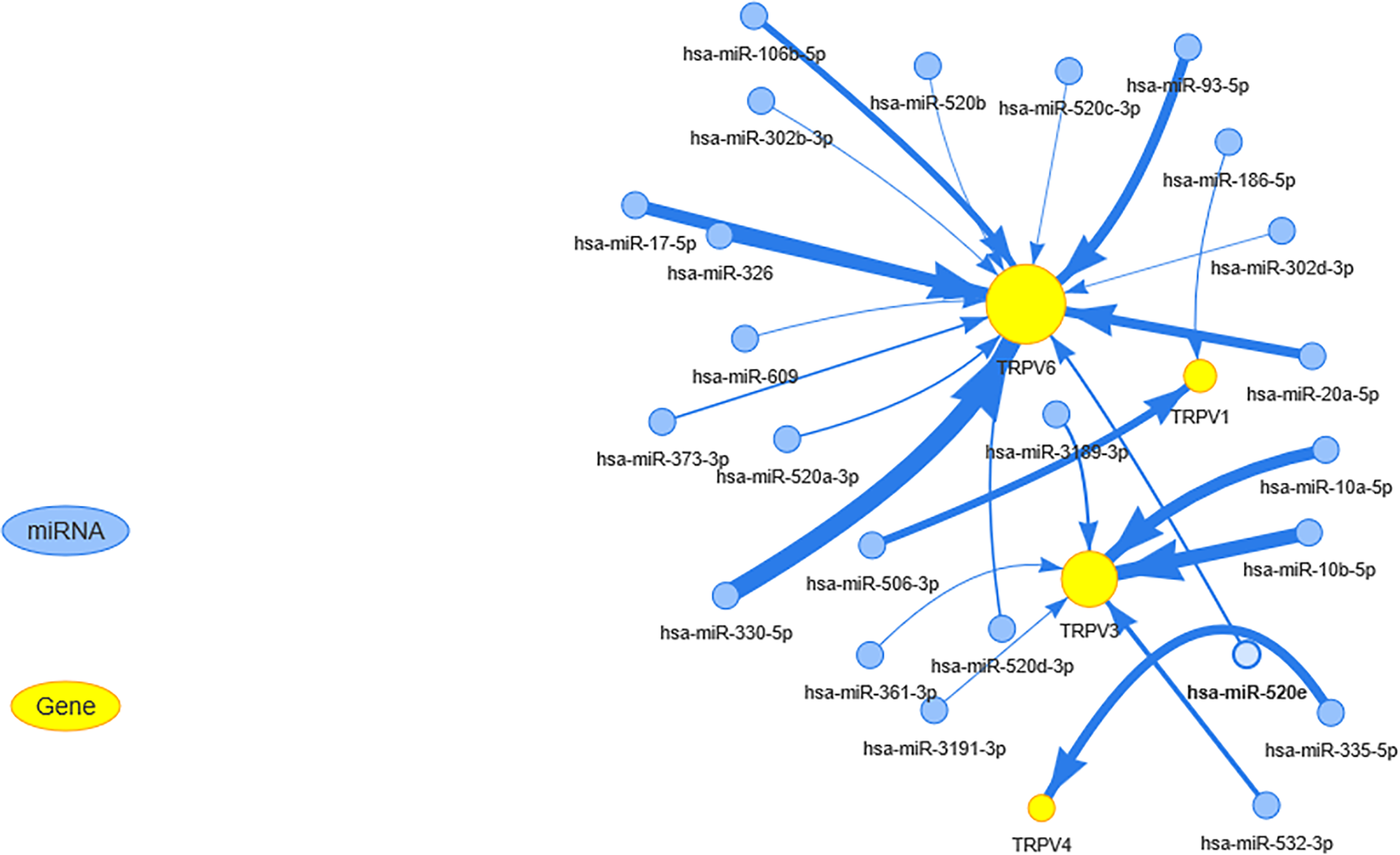 The miRNA regulation network of TRPV channel-related genes. The connection between mRNA and miRNA indicates that the mRNA is regulated by this miRNA. The larger the yellow dot size, the greater the association with miRNA regulation. The size of arrow edge width depends on the absolute value of the correlation coefficient.