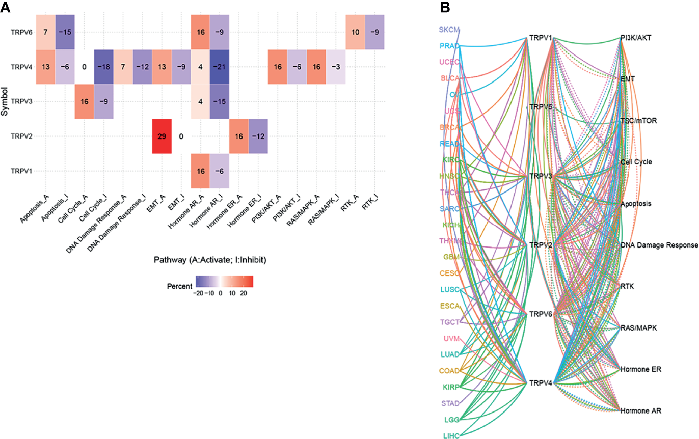 The pathway activity network between TRPV channels. (A) The combined percentage of TRPV regulator genes influencing pathway activity. (B) The line represents the connection between different pathways, where solid lines of the connecting pathways represent activation and dotted lines of the connecting pathways represent inhibition. The colors of the lines represent different types of cancer.
