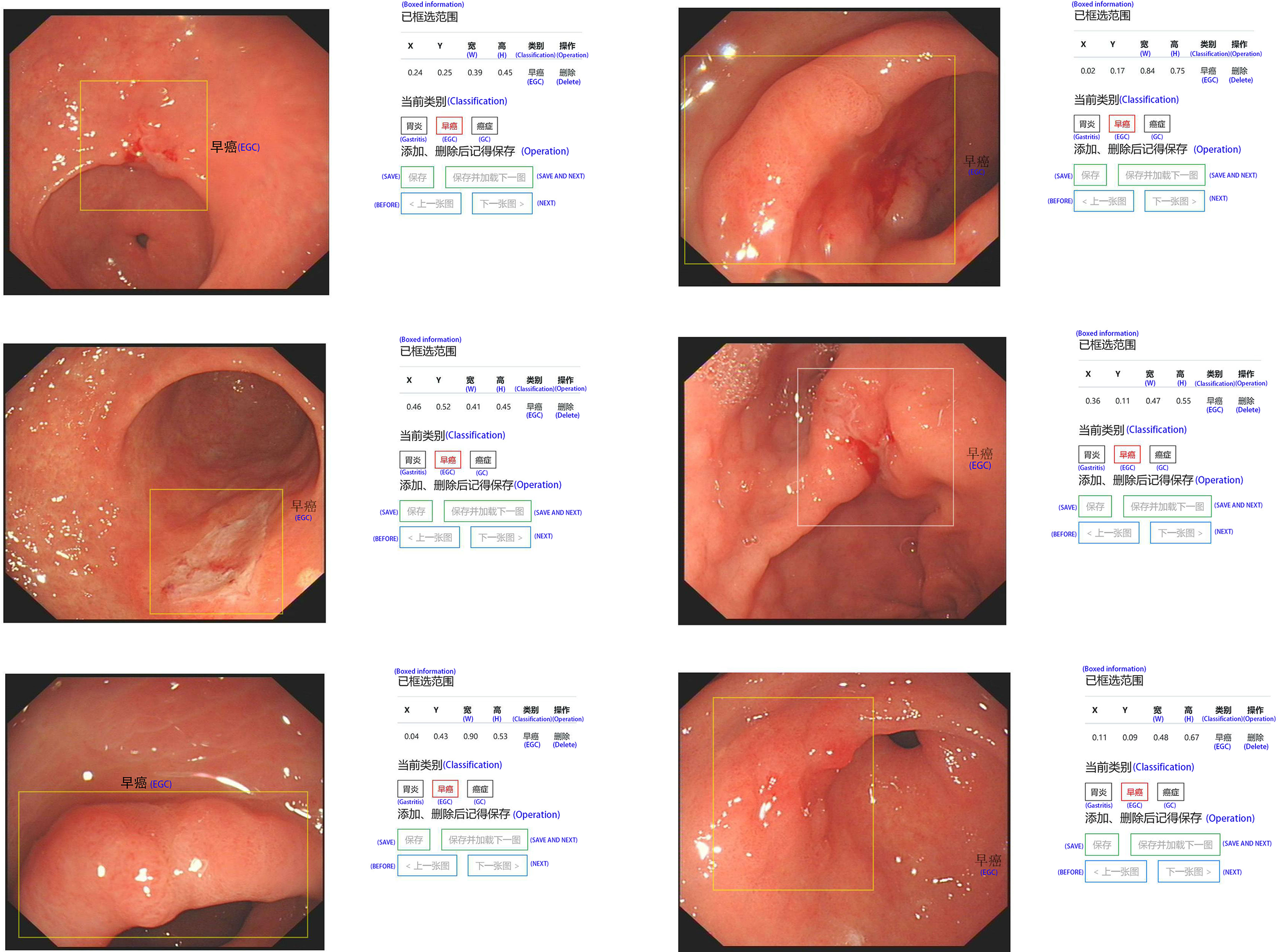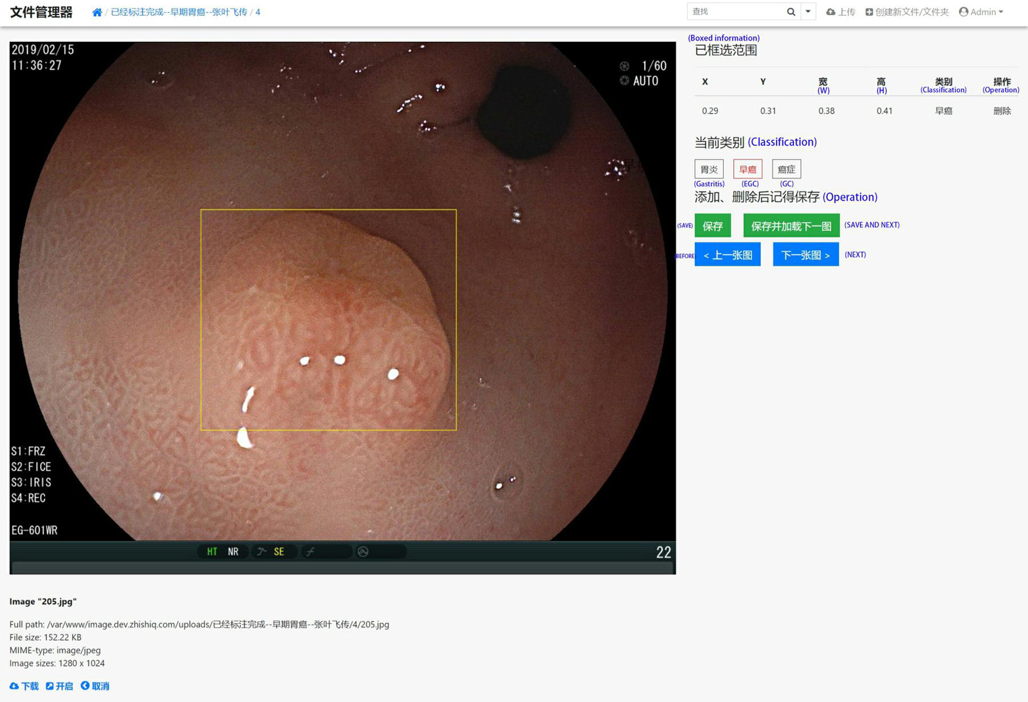 A screenshot of the website database platform and online image annotation we created in this study. The yellow rectangular box shows the diagnosed early gastric cancer lesion. The size and location (x, y, w, and h) of the selected site were displayed in real time on the right side of the image, while the type of lesion (gastritis, early gastric cancer, progressive gastric cancer) of the selected site was annotated. The original information including source, size, format, and resolution is displayed below the image.