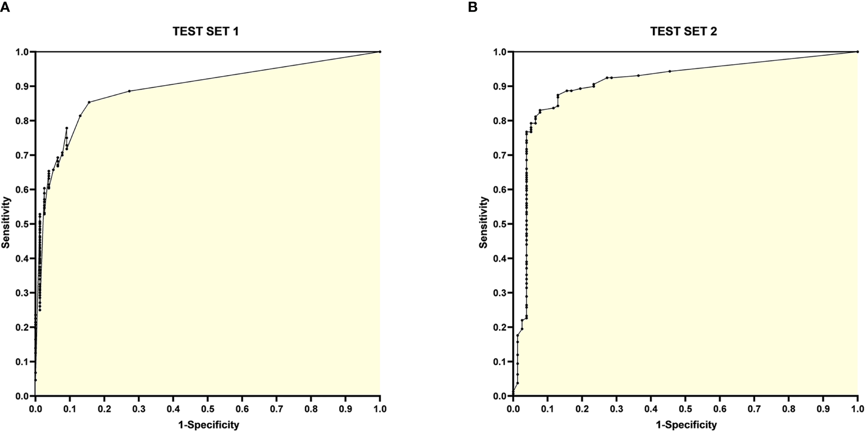 The ROC curves for Test Set 1 and 2 with sensitivity and 1-specificity are shown in Figure 4.