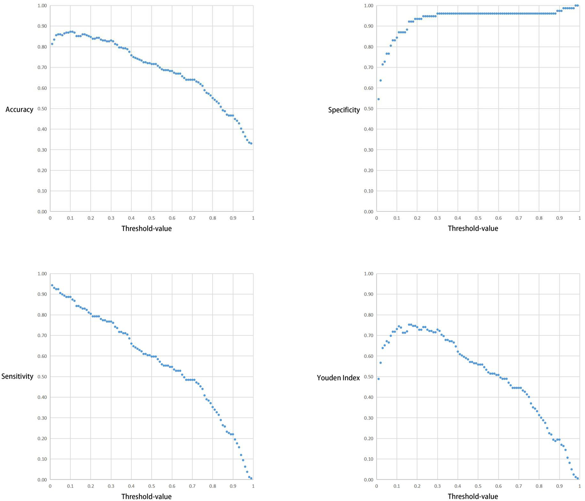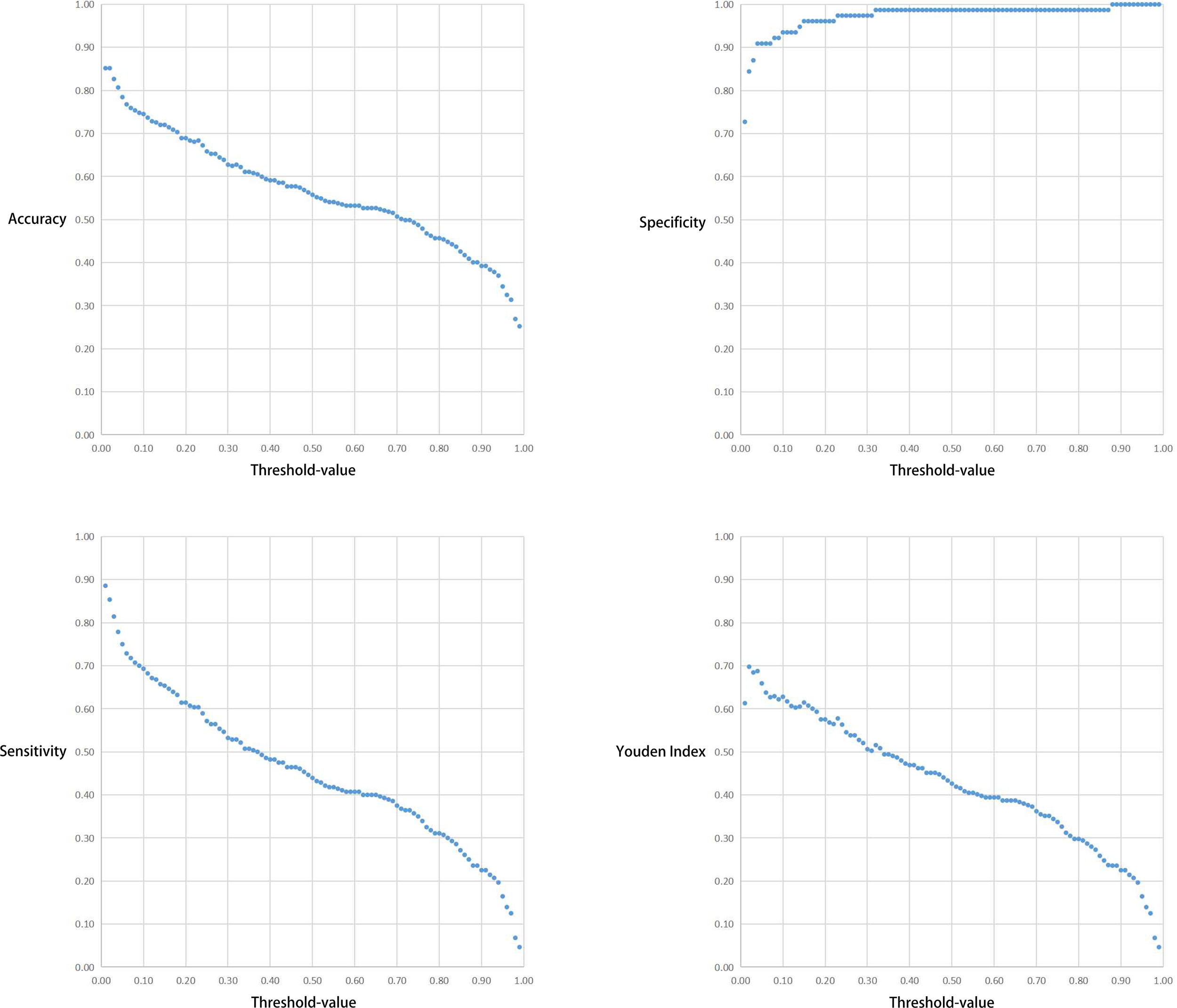 The correlation between the Threshold-value and sensitivity, specificity, accuracy and Youden index are presented in Figures 5 and 6. As the Threshold-value increased, there was a tendency for the accuracy, sensitivity and Youden index values to decrease significantly, while the specificity fluctuated between 0.8 and 1.0 in Test Set 1 and Test Set 2.