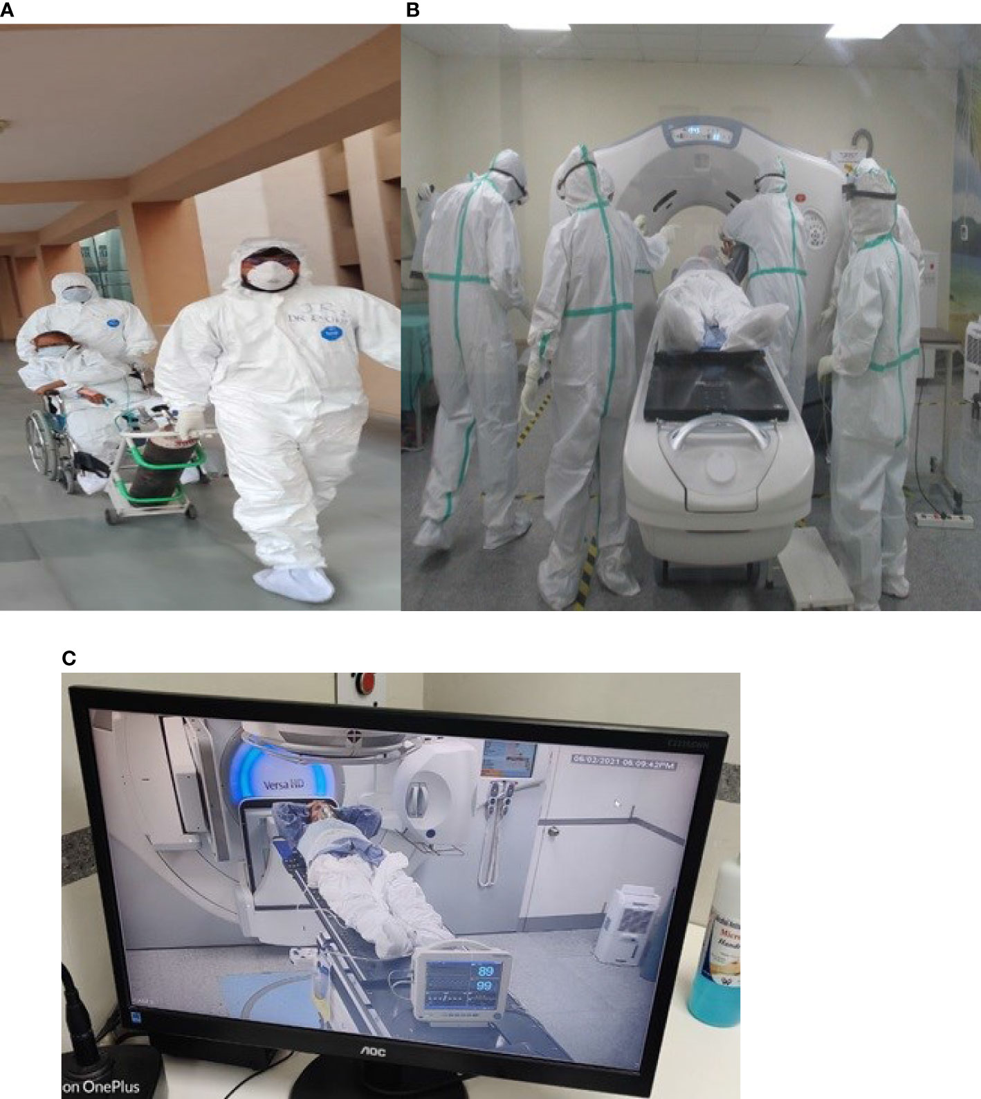 Figure 1 (A) (left) and (B) (right): Show the transfer and CT Simulation of the COVID 19 patients enrolled in our trial, maintaining proper personal protection. (C) Shows the continuous Surveillance and Monitoring of the patient during the delivery of LDRT.