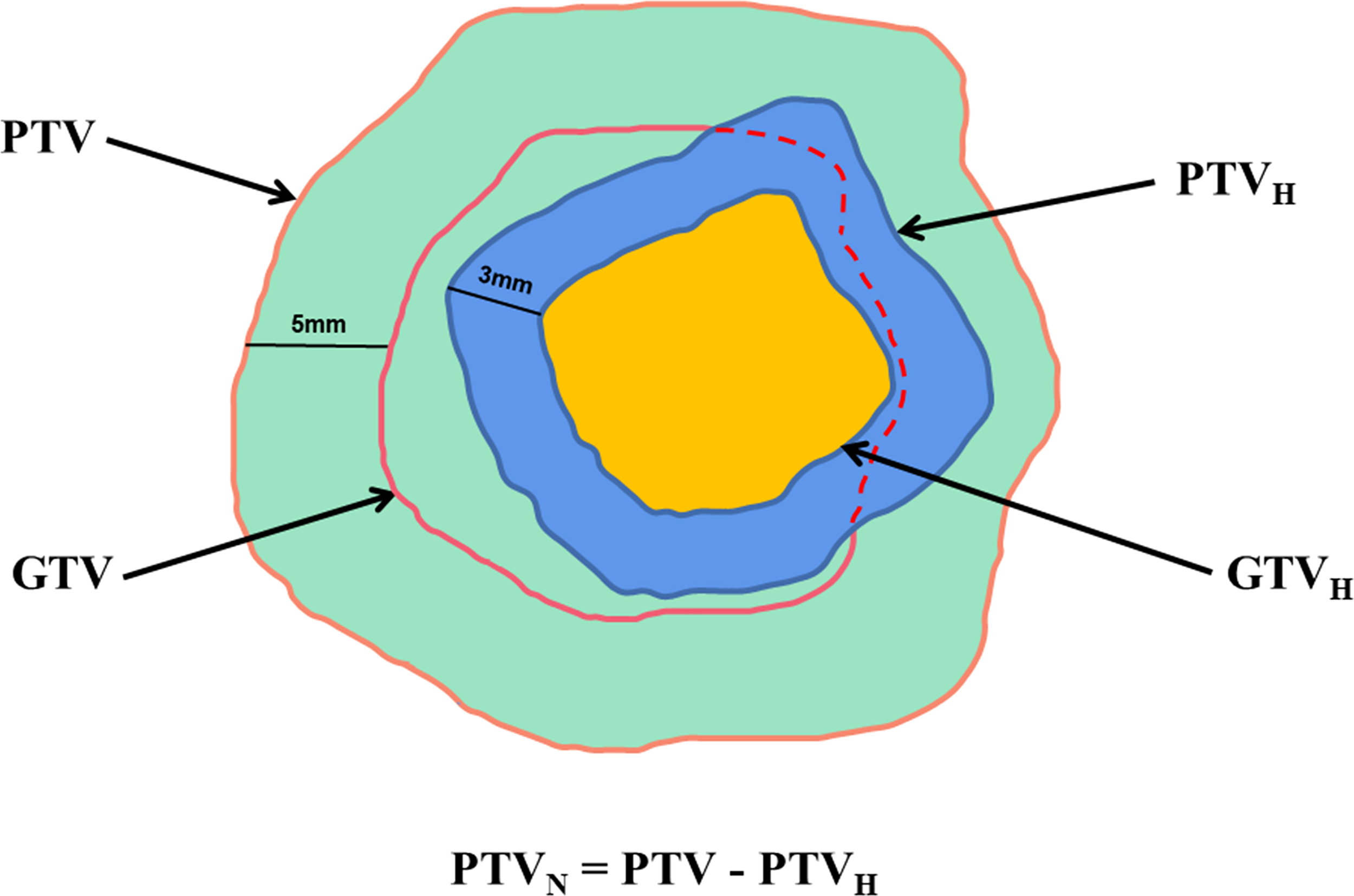 GTV had a volume range of 8.4-118.0 cm3, with an average volume of 34.5 cm3. And mean GTVH was 17.0 (4.5-58.3) cm3,accounting for 49.3% of the GTV. The PTV, PTVH and PTVN were 72.0 cm3, 41.5 cm3 and 30.5 cm3, respectively. The ratios of PTVH to PTV and PTVN to PTV were 57.6% and 42.4%, respectively, as shown in Table 1 and Figure 3.